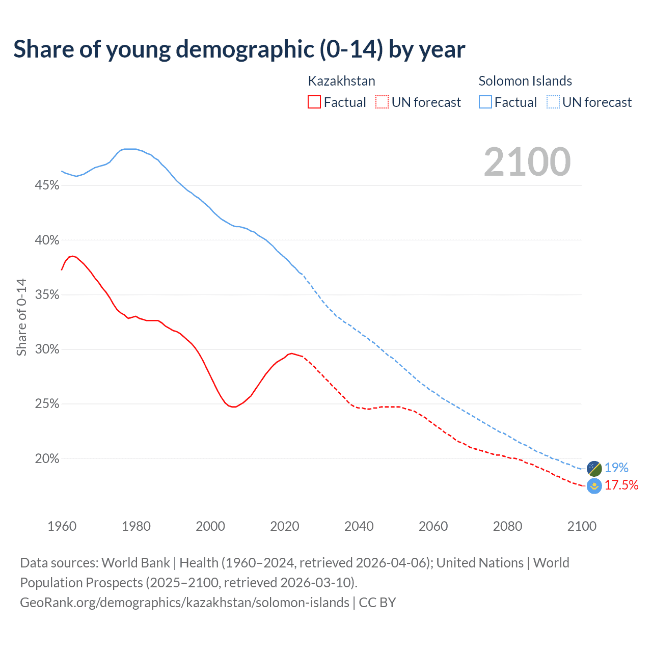 - The share of young demographic (0-15 years old) in Kazakhstan is 29.4% vs 37% in the Solomon Islands.