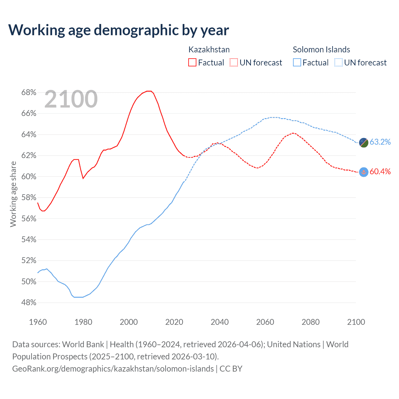 - Kazakhstan has 13.1M working age adults (aged 15-64) vs 513K in the Solomon Islands.