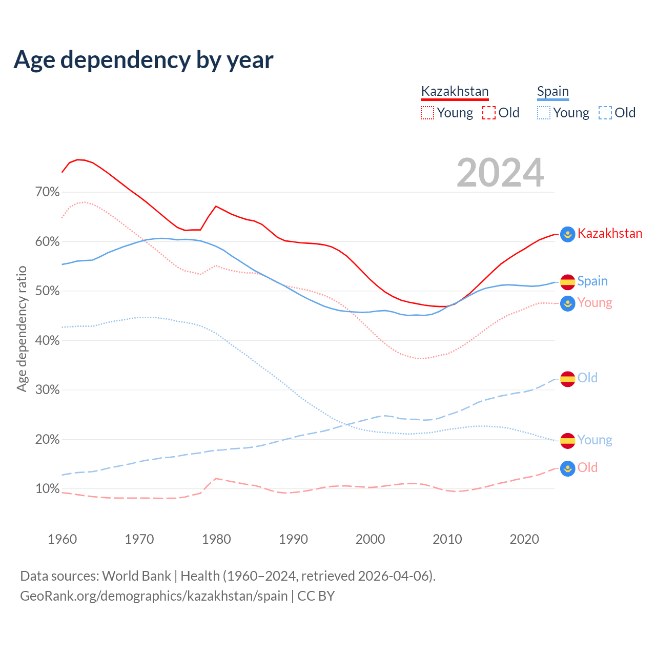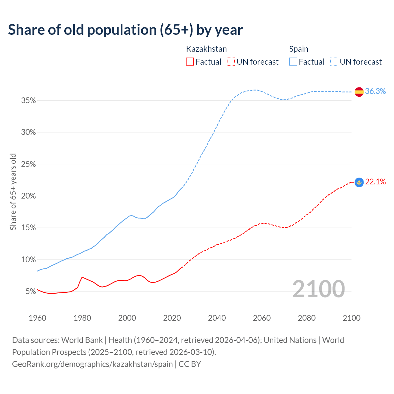 The share of older people aged 65 and over is 8.65% in Kazakhstan and 21.1% in Spain. Life expectancy in Kazakhstan compared to Spain .