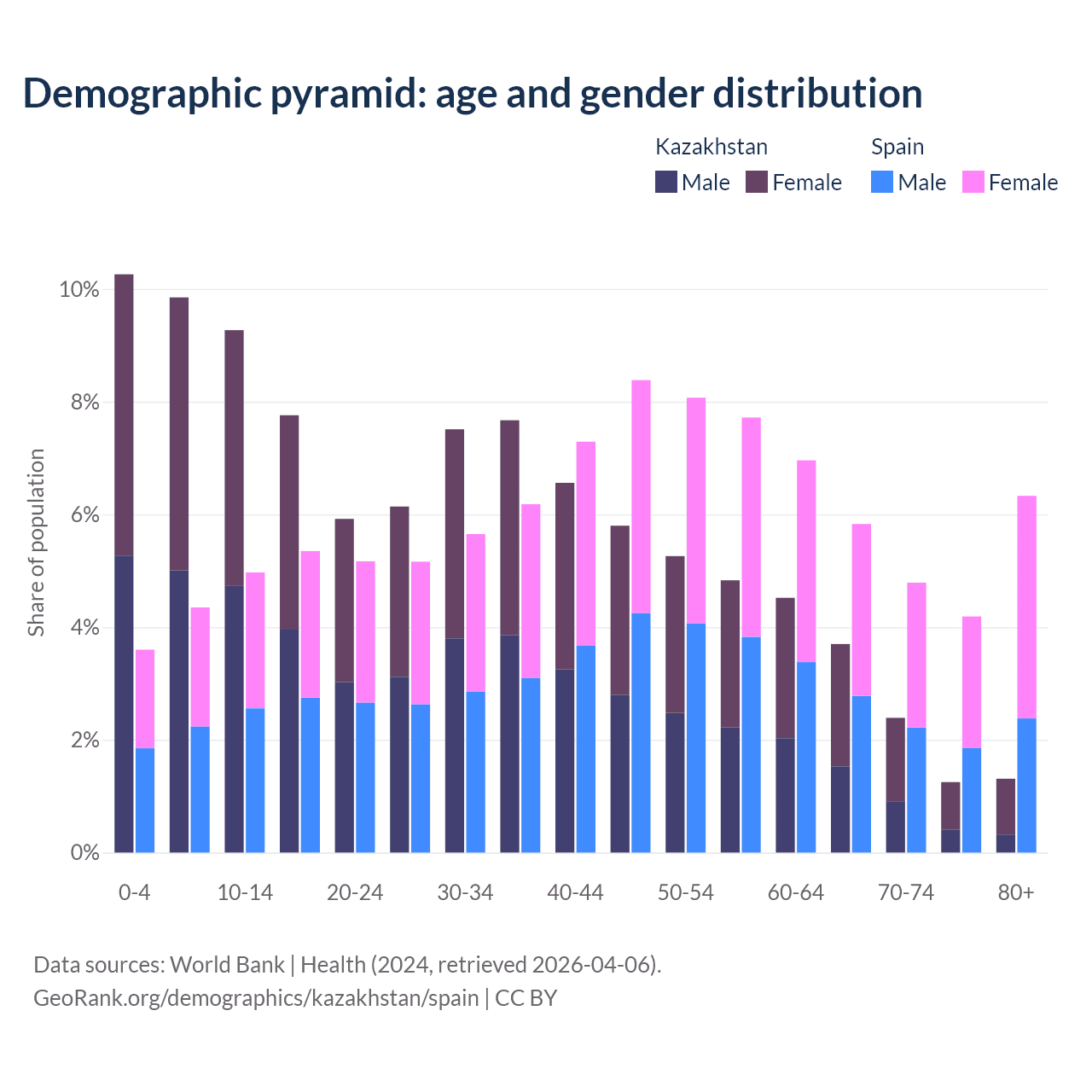 - Kazakhstan is ranked 99/196 by median age (oldest to youngest) vs 7/196 for Spain.