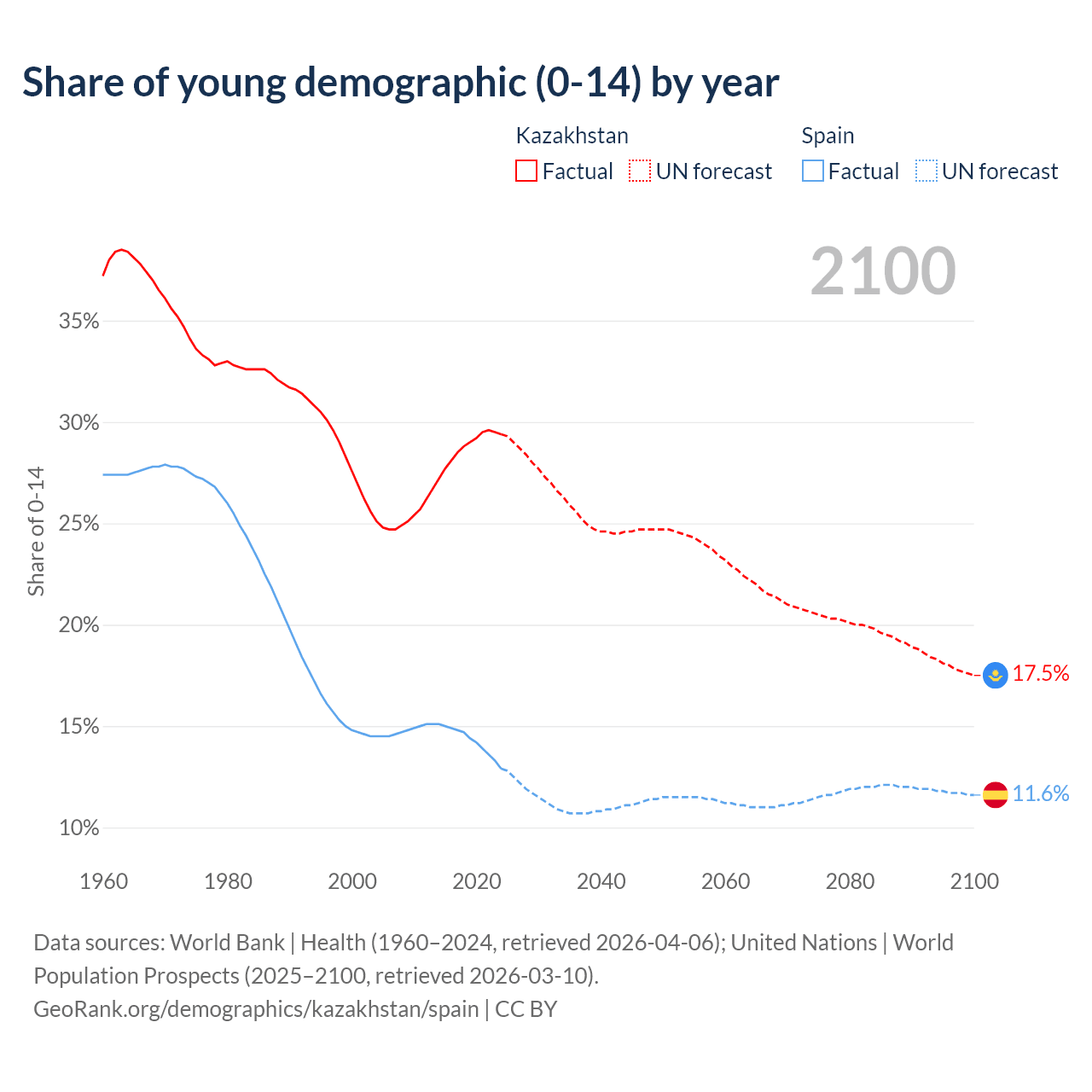 - The share of young demographic (0-15 years old) in Kazakhstan is 29.4% vs 12.9% in Spain.