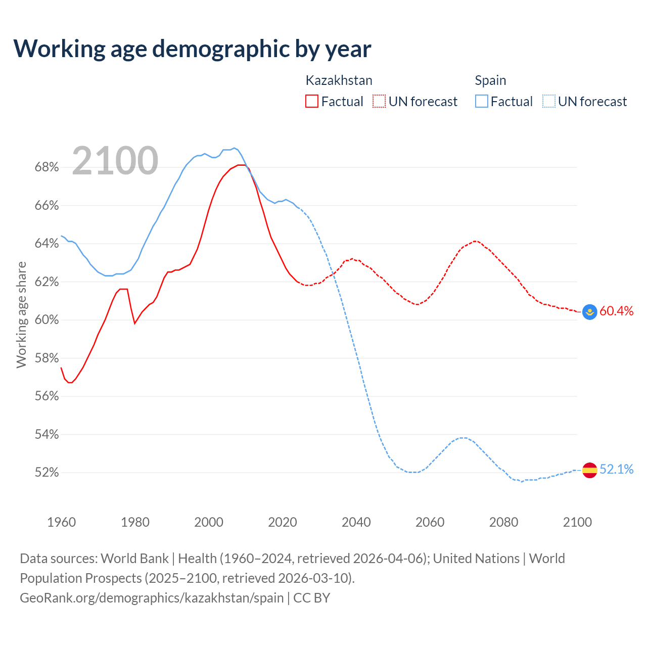 - Kazakhstan has 13.1M working age adults (aged 15-64) vs 32.2M in Spain.