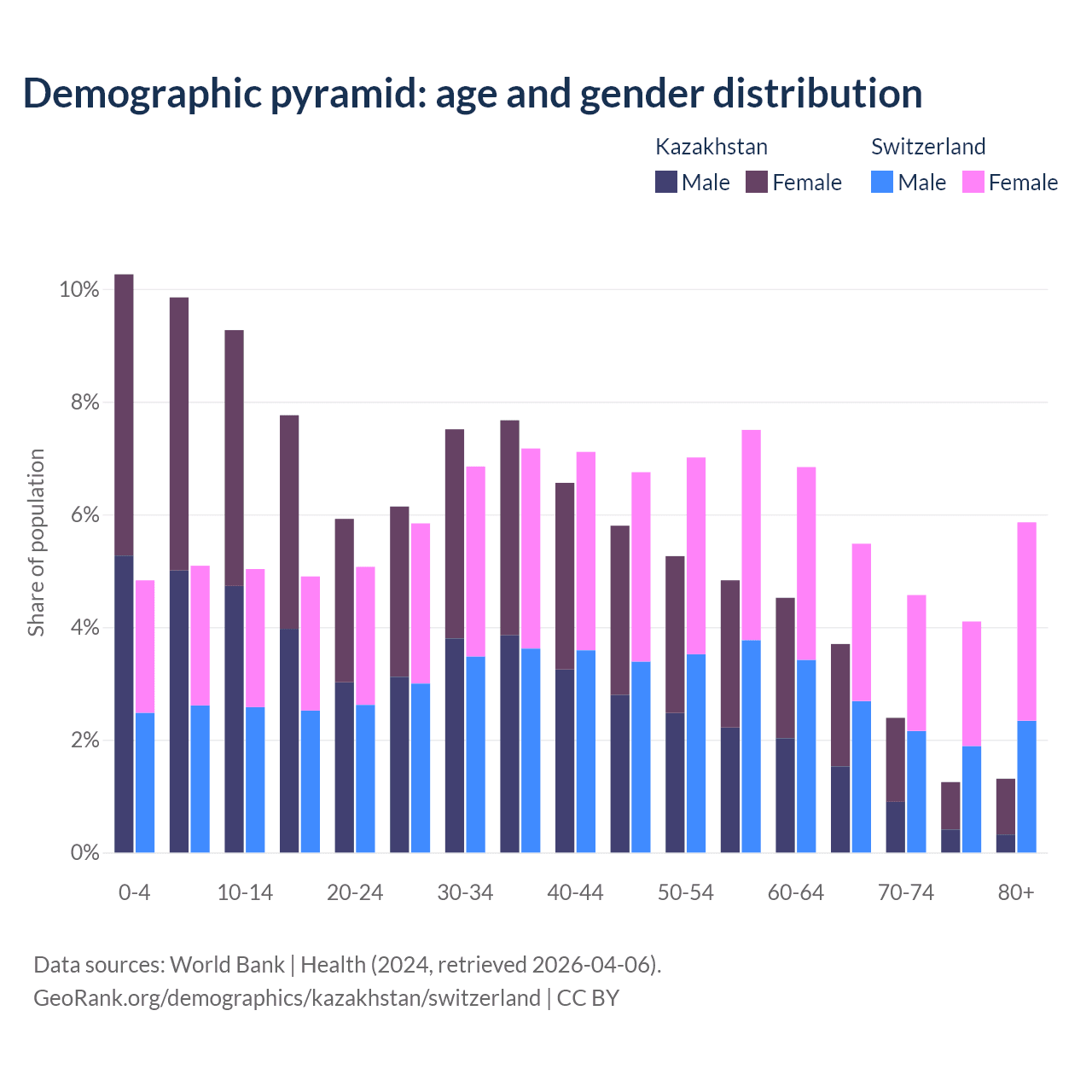 - Kazakhstan is ranked 99/196 by median age (oldest to youngest) vs 24/196 for Switzerland.