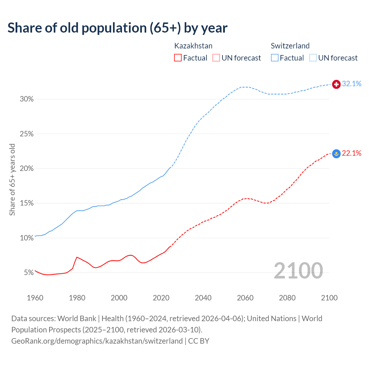 The share of older people aged 65 and over is 8.65% in Kazakhstan and 20% in Switzerland. Life expectancy in Kazakhstan compared to Switzerland .