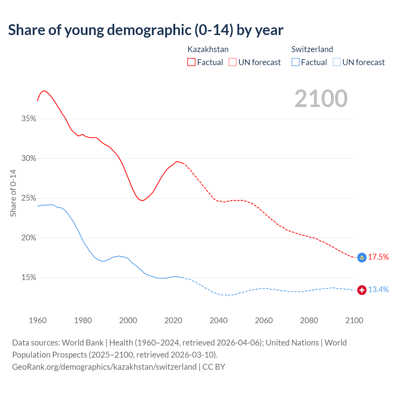 - The share of young demographic (0-15 years old) in Kazakhstan is 29.4% vs 15% in Switzerland.