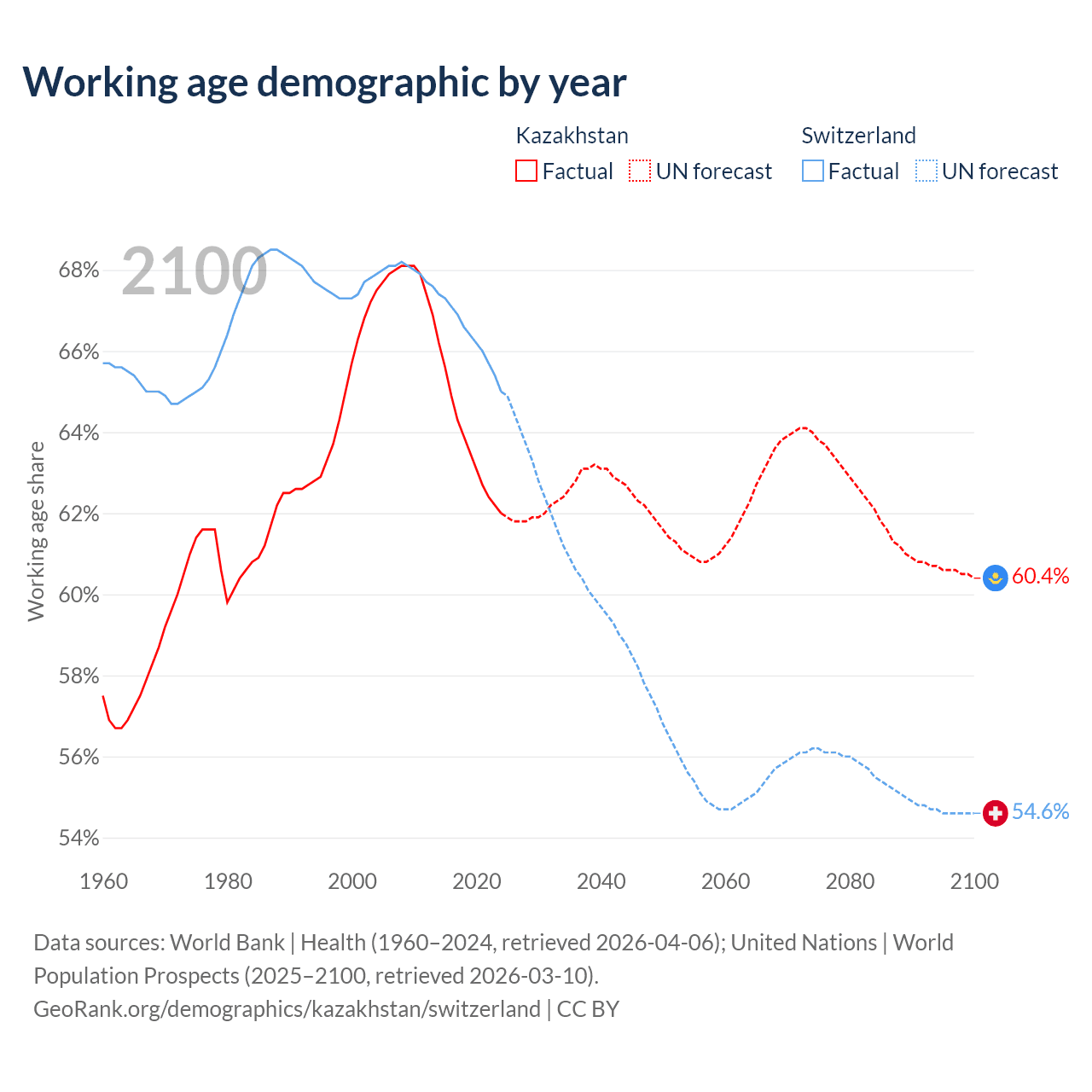- Kazakhstan has 13.1M working age adults (aged 15-64) vs 5.92M in Switzerland.
