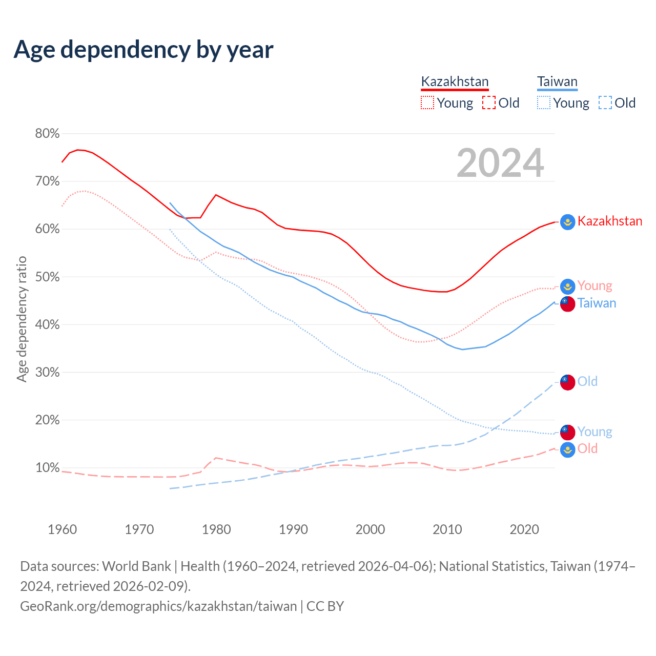 - Kazakhstan is ranked 99/196 by median age (oldest to youngest) vs 16/196 for Taiwan.