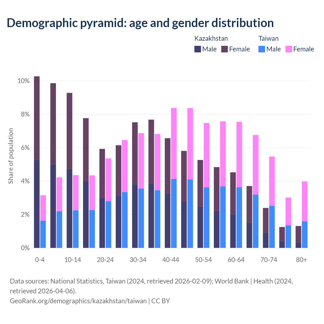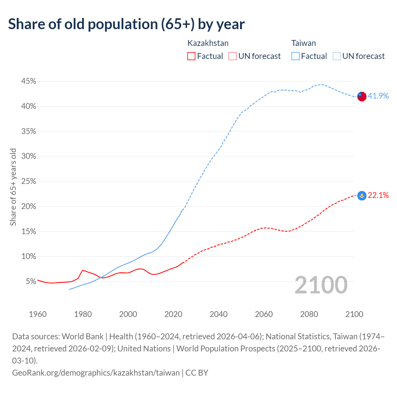 The share of older people aged 65 and over is 8.65% in Kazakhstan and 19.2% in Taiwan. Life expectancy in Kazakhstan compared to Taiwan .