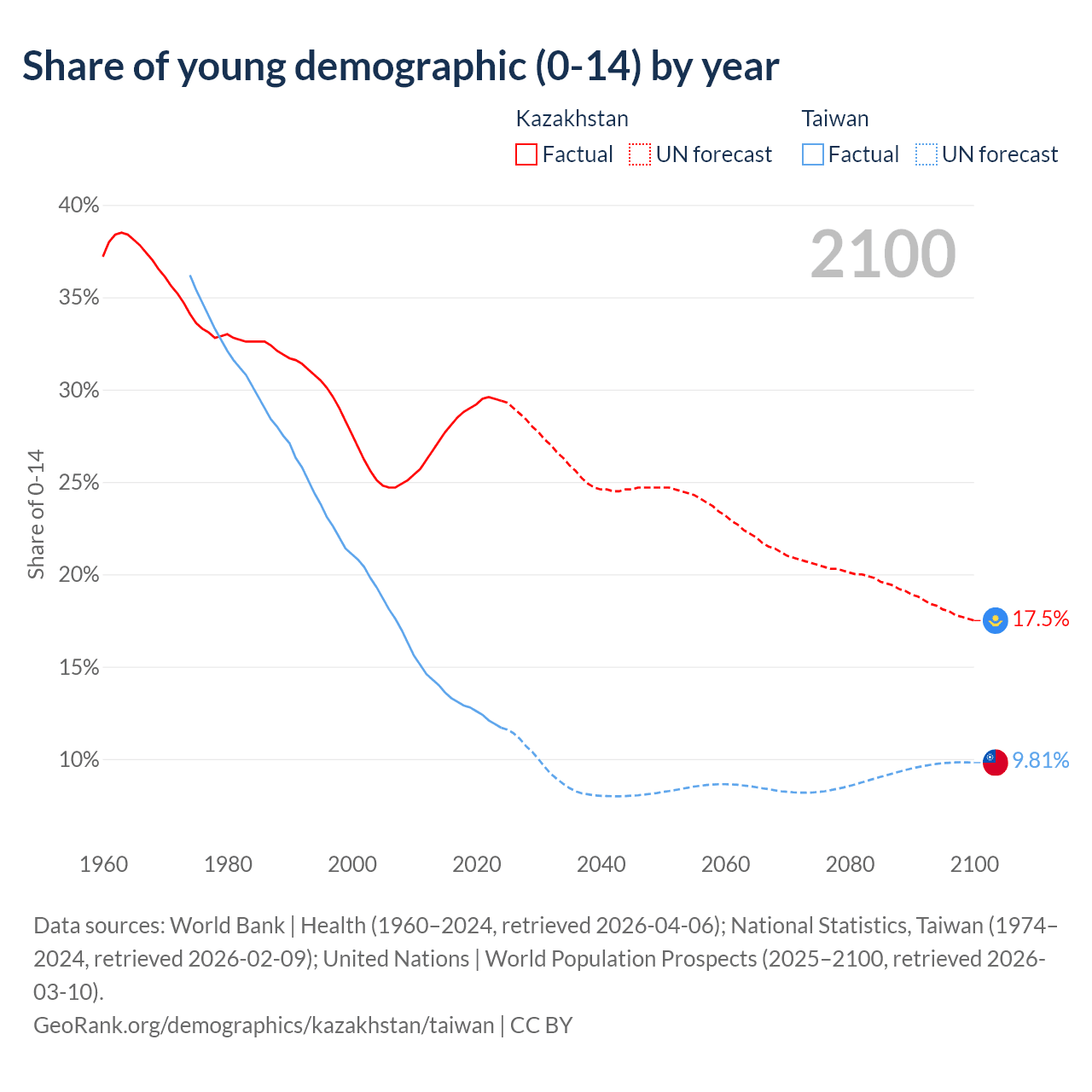 - The share of young demographic (0-15 years old) in Kazakhstan is 29.4% vs 11.7% in Taiwan.