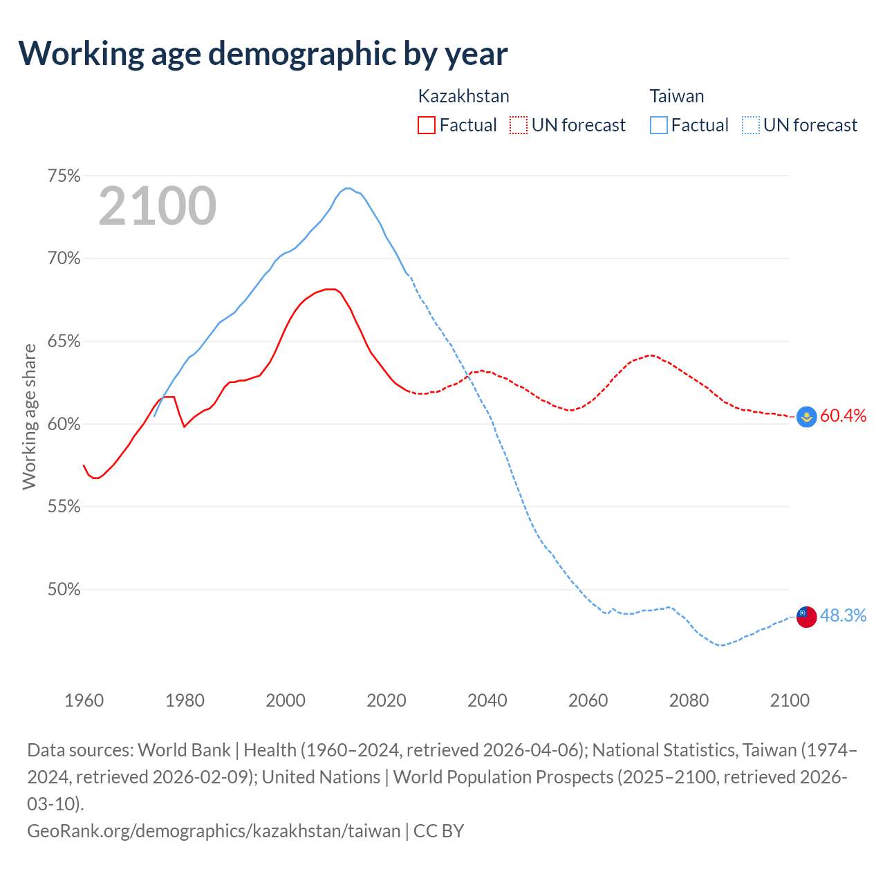 - Kazakhstan has 13.1M working age adults (aged 15-64) vs 16.1M in Taiwan.