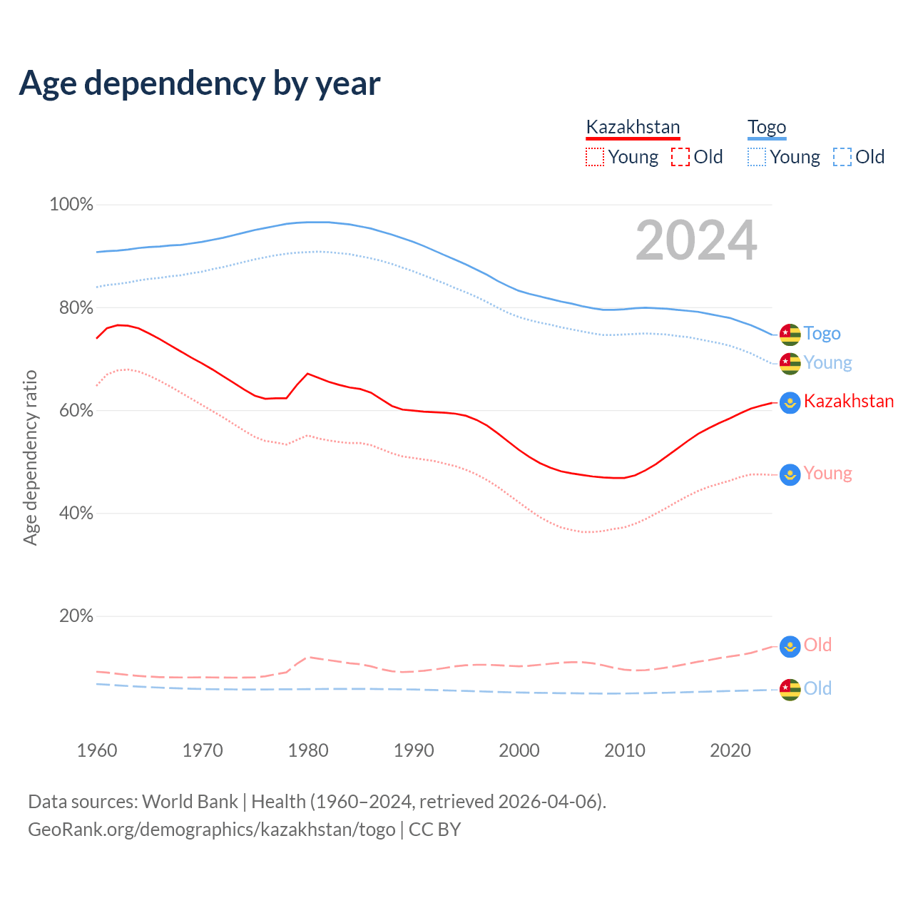 - The share of old-age demographic (65+) in Kazakhstan is 8.65% vs 3.21% in Togo.