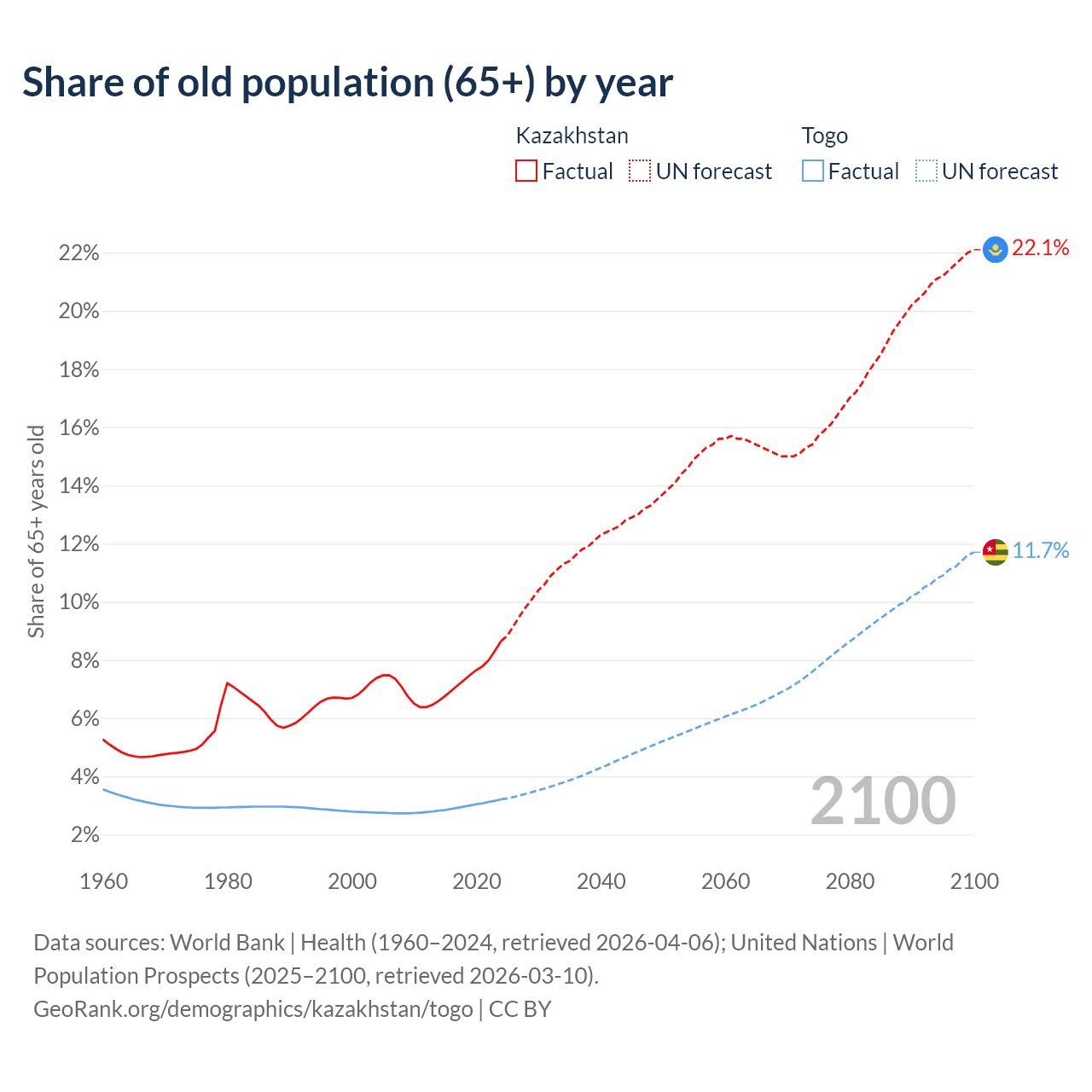 The share of older people aged 65 and over is 8.65% in Kazakhstan and 3.21% in Togo. Life expectancy in Kazakhstan compared to Togo .