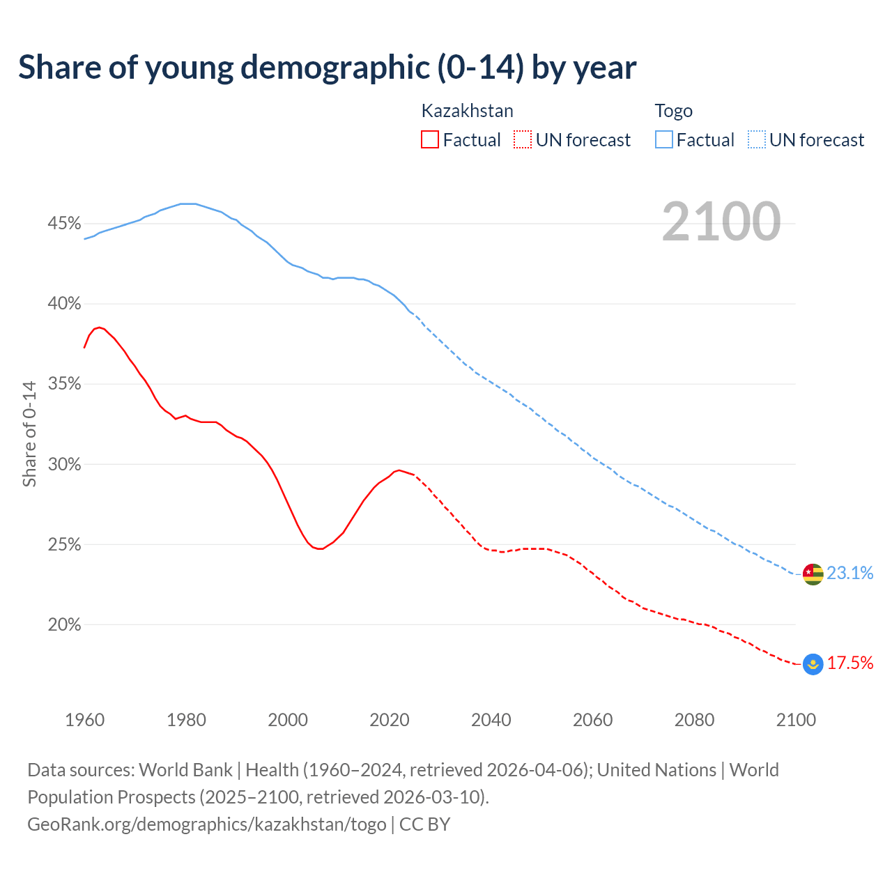 - The share of young demographic (0-15 years old) in Kazakhstan is 29.4% vs 39.5% in Togo.