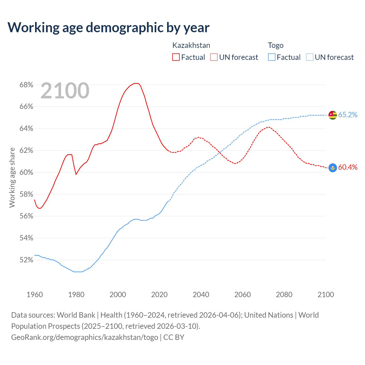 - Kazakhstan has 13.1M working age adults (aged 15-64) vs 5.72M in Togo.