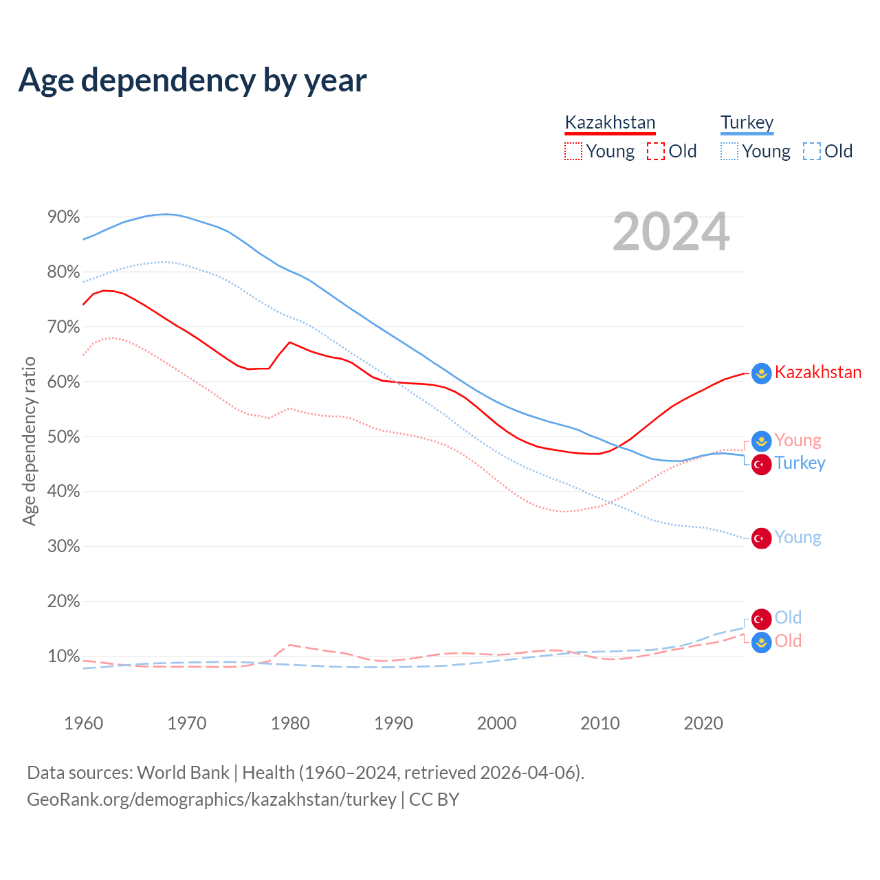 Data sources: World Bank | Health (1960–2024, retrieved 2026-04-06); U.S. Census Bureau (1960–2024, retrieved 2026-02-08).