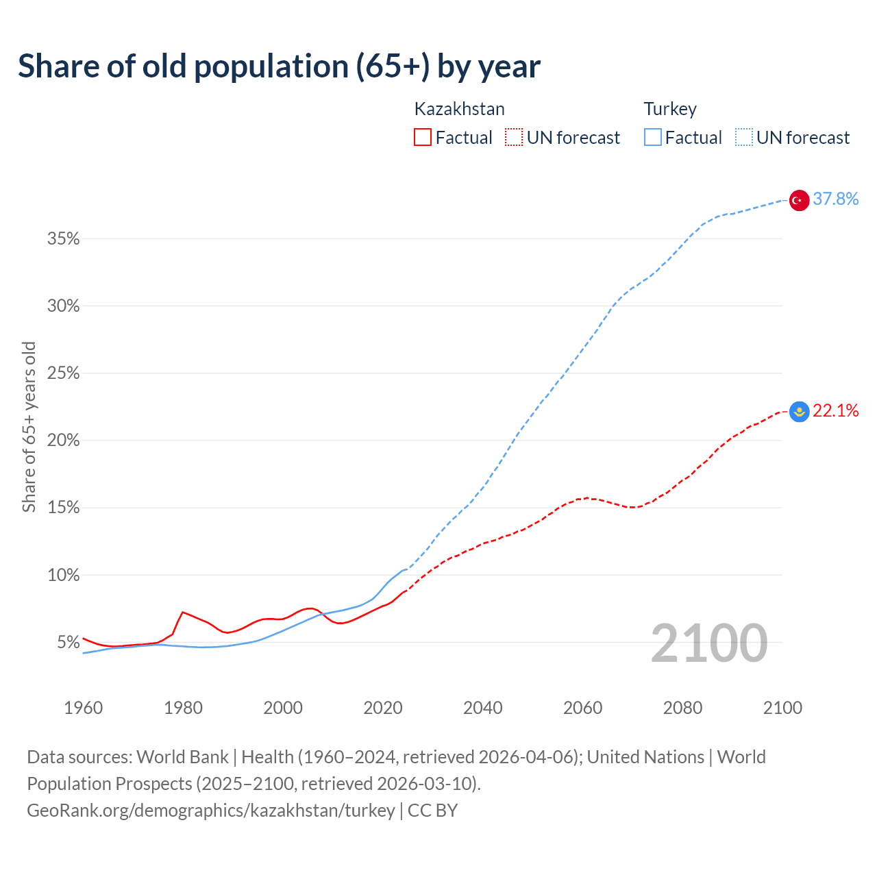 The share of older people aged 65 and over is 8.65% in Kazakhstan and 10.3% in Turkey. Life expectancy in Kazakhstan compared to Turkey .