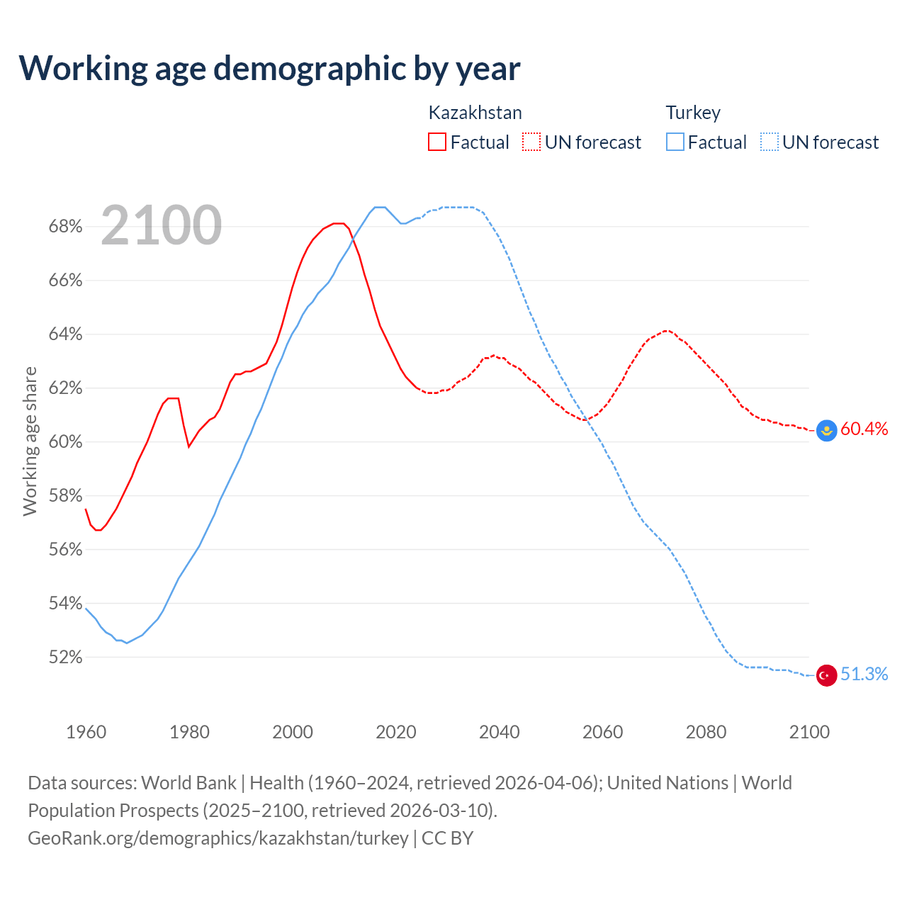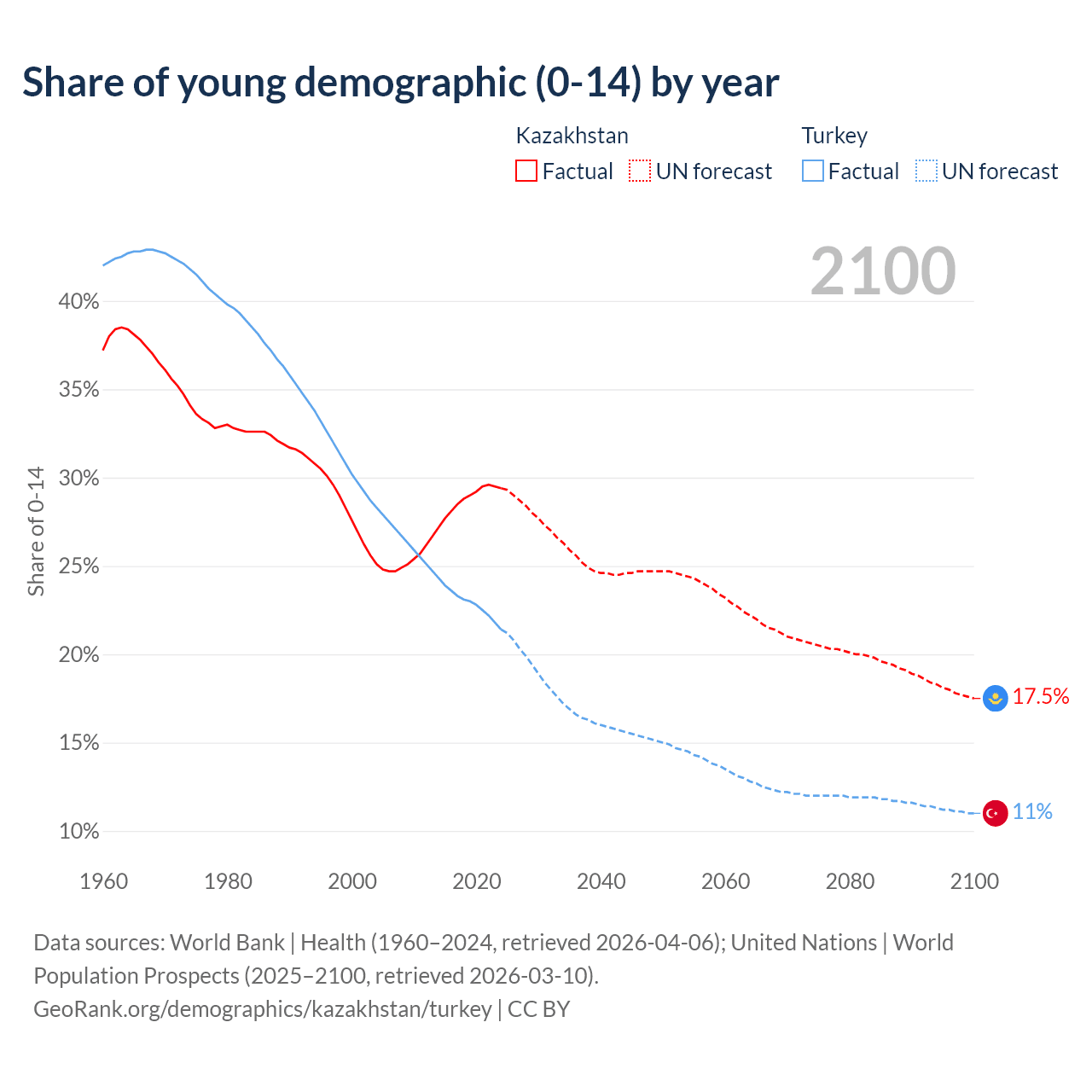 Median age Kazakhstan vs Turkey, 1960-2100