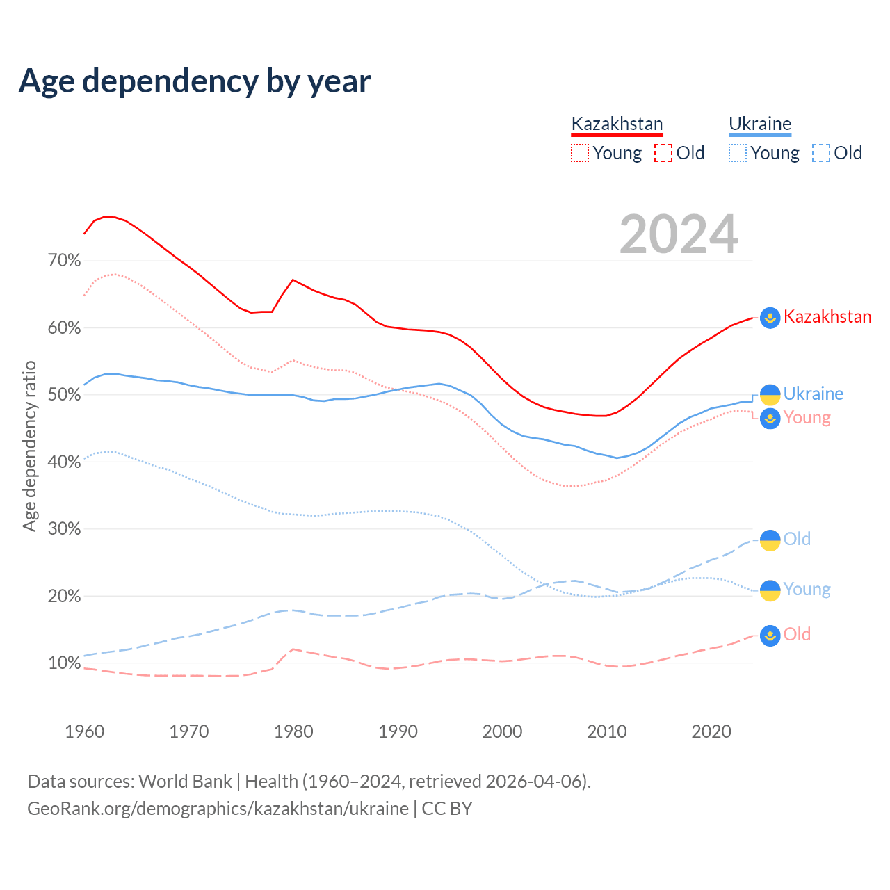 Data sources: World Bank | Health (1960–2024, retrieved 2026-04-06); U.S. Census Bureau (1960–2024, retrieved 2026-02-08).