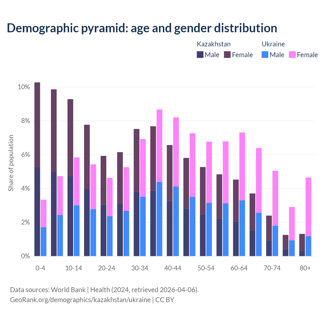 - Kazakhstan is ranked 99/196 by median age (oldest to youngest) vs 26/196 for Ukraine.