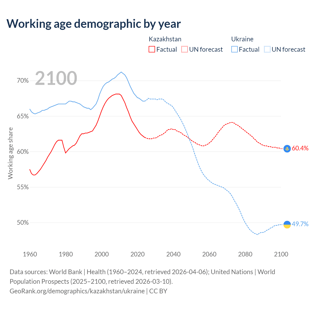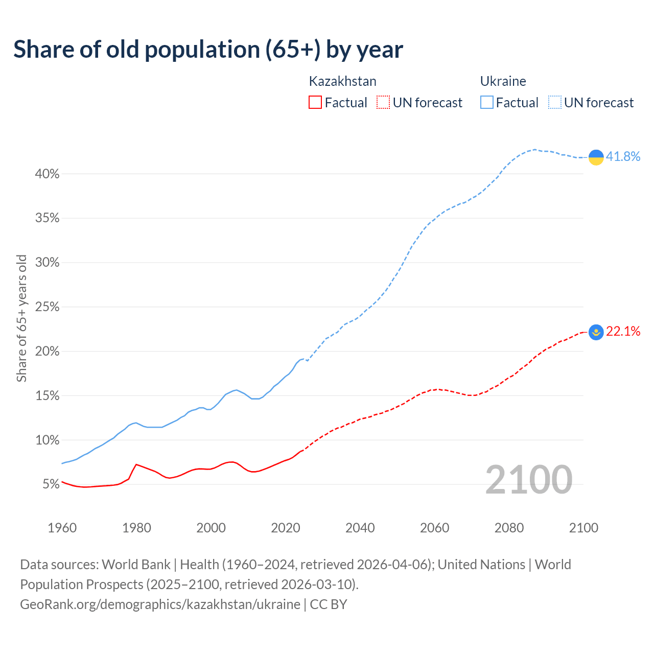 Median age Kazakhstan vs Ukraine, 1960-2100