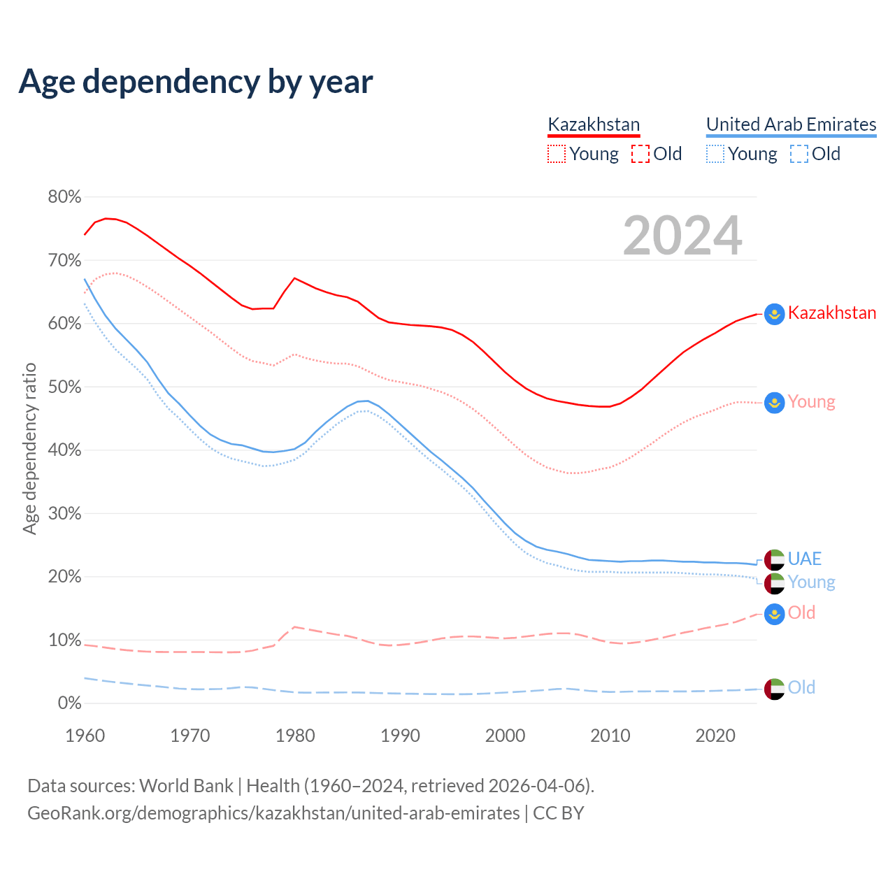 Data sources: World Bank | Health (1960–2024, retrieved 2026-04-06); U.S. Census Bureau (1960–2024, retrieved 2026-02-08).