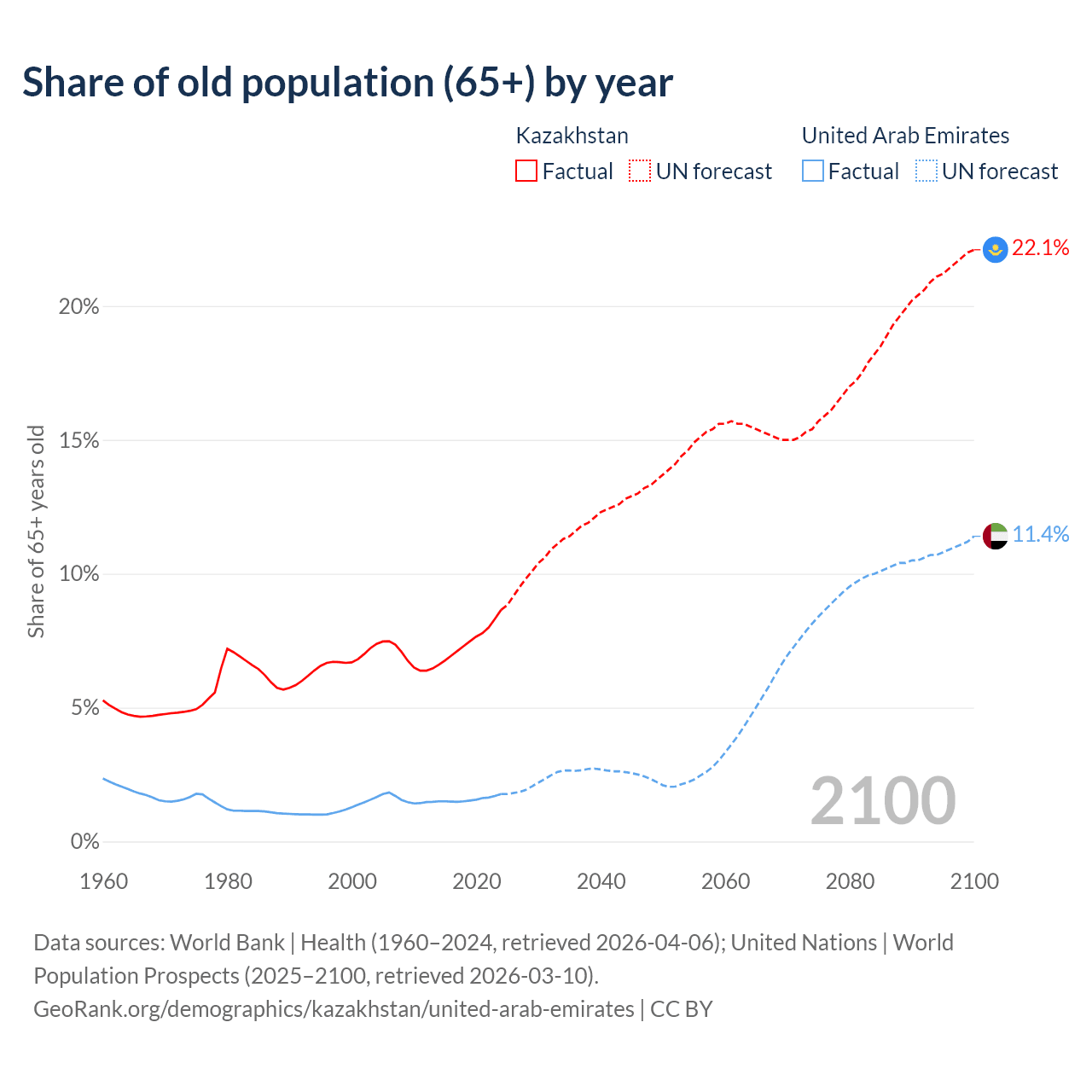 The share of older people aged 65 and over is 8.65% in Kazakhstan and 1.77% in the United Arab Emirates. Life expectancy in Kazakhstan compared to the United Arab Emirates .