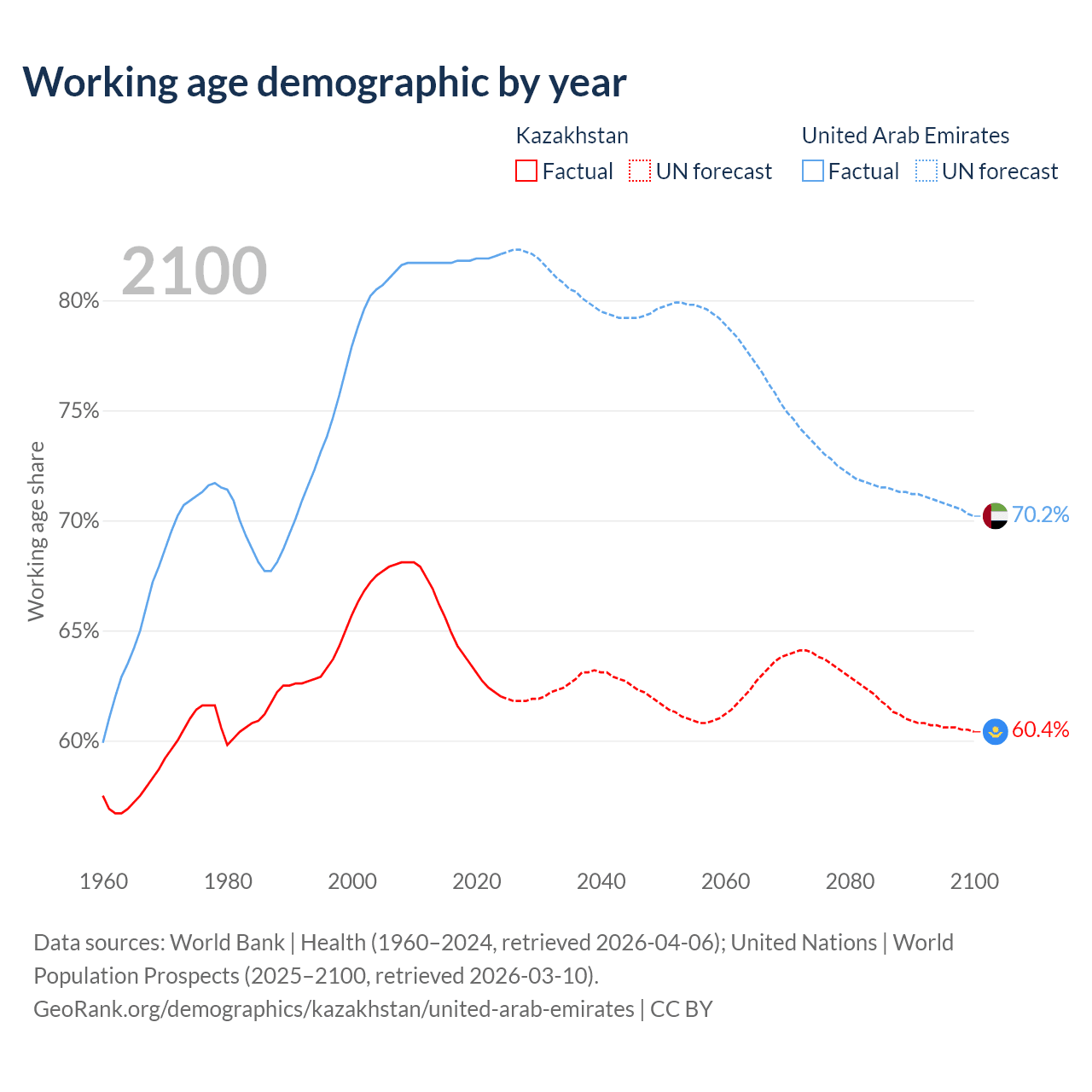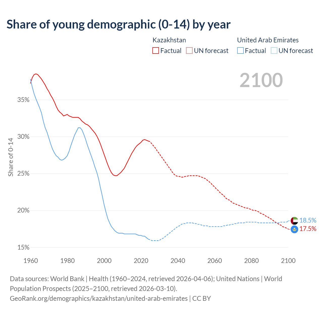 Median age Kazakhstan vs United Arab Emirates, 1960-2100