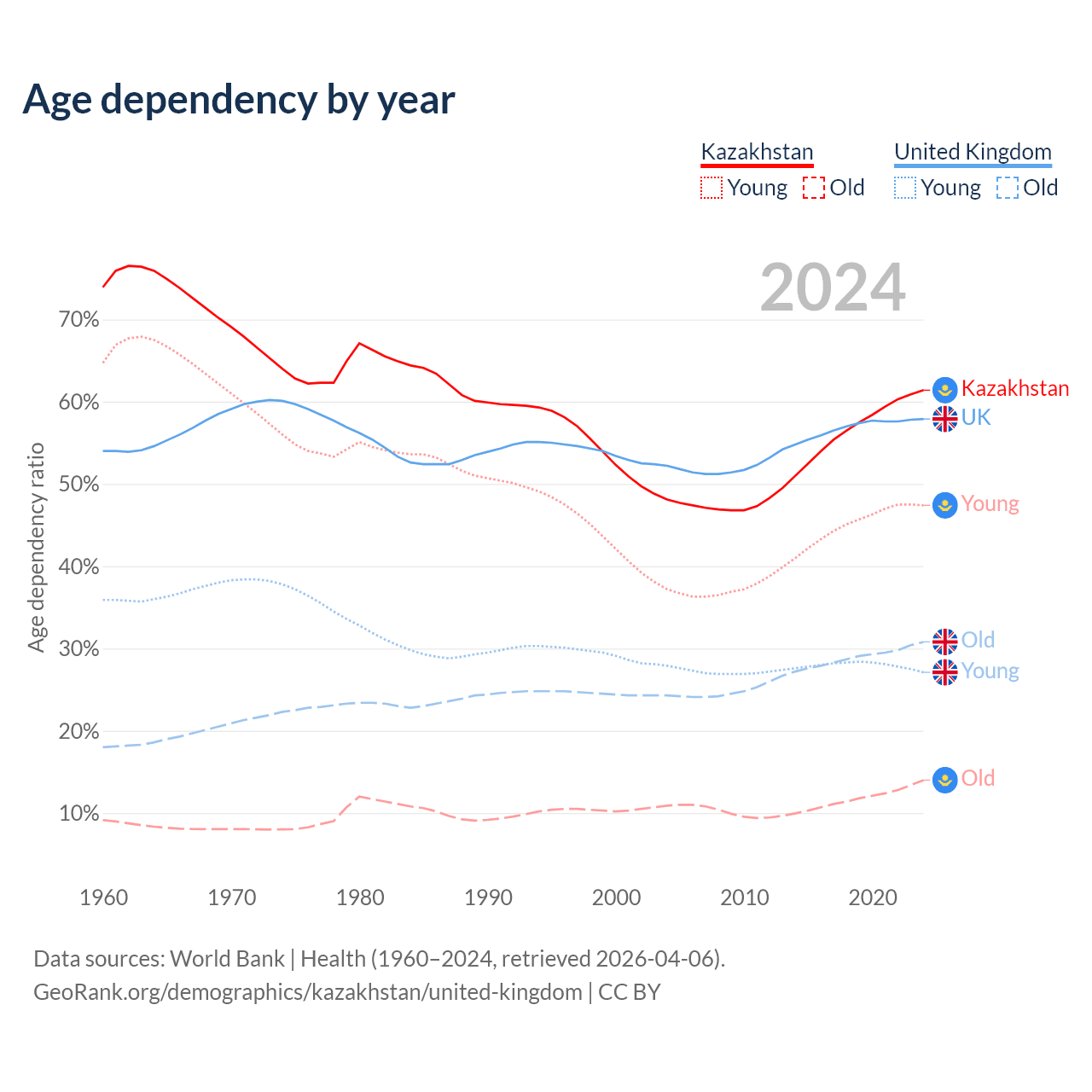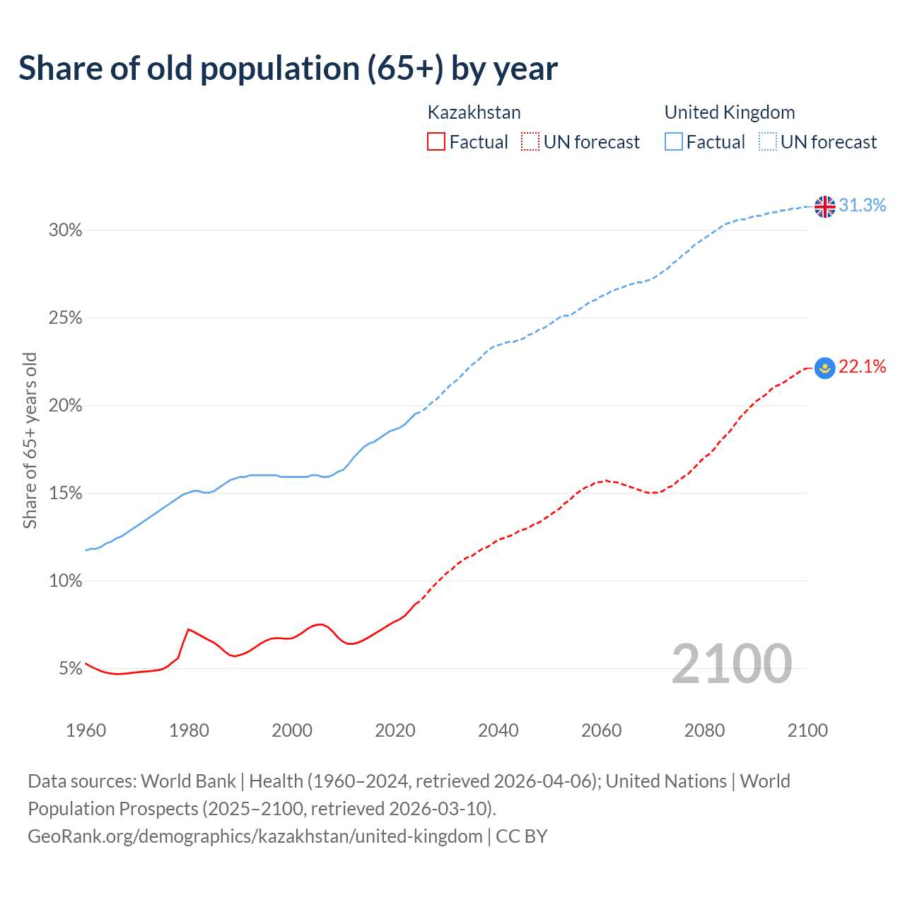 The share of older people aged 65 and over is 8.65% in Kazakhstan and 19.5% in the United Kingdom. Life expectancy in Kazakhstan compared to the United Kingdom .