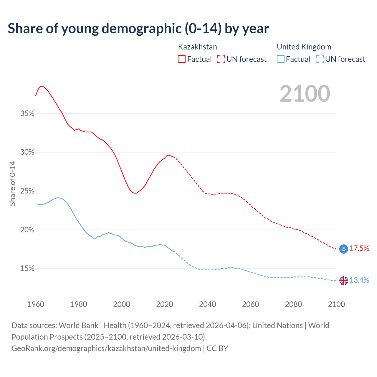 - The share of young demographic (0-15 years old) in Kazakhstan is 29.4% vs 17.2% in the United Kingdom.