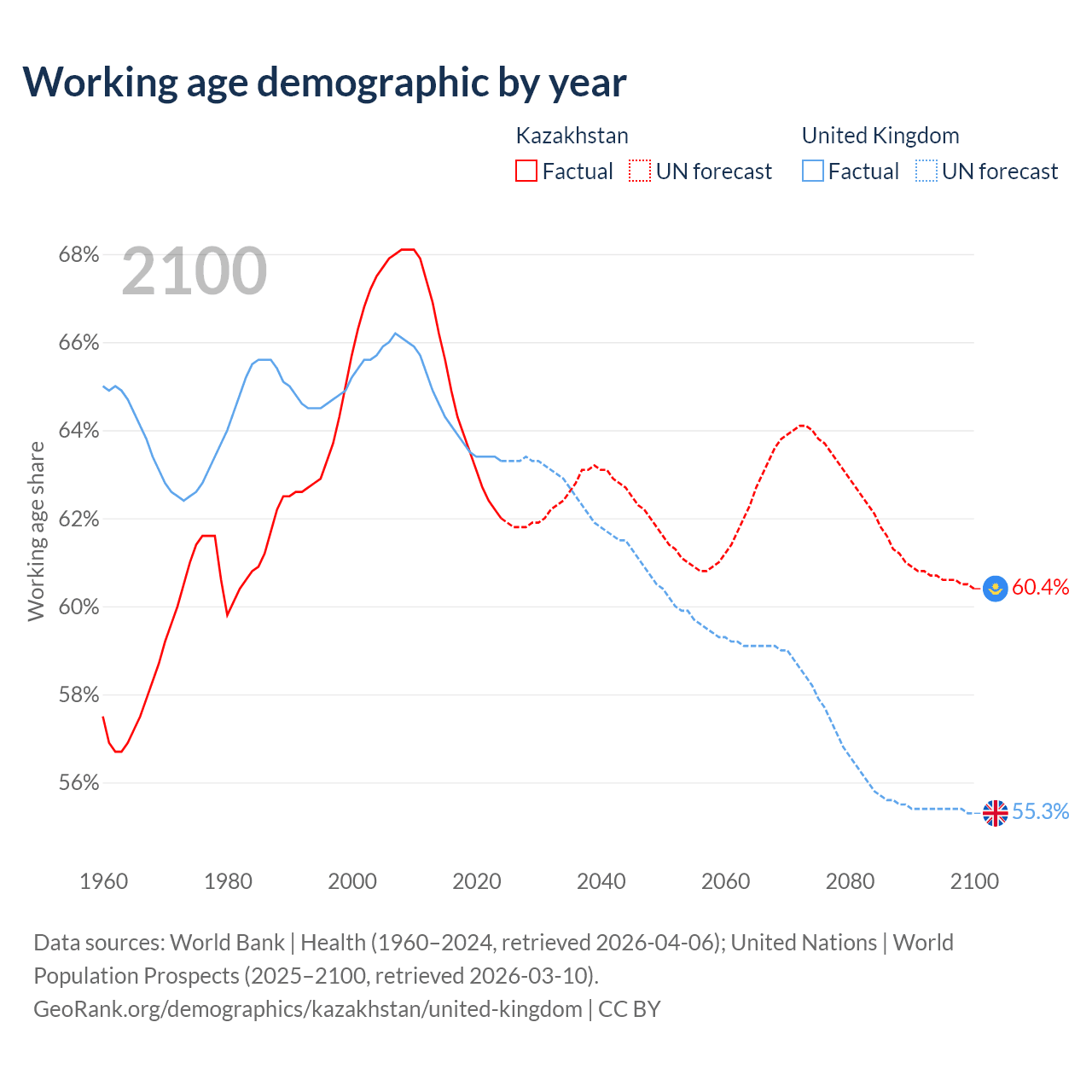 - Kazakhstan has 13.1M working age adults (aged 15-64) vs 44.4M in the United Kingdom.