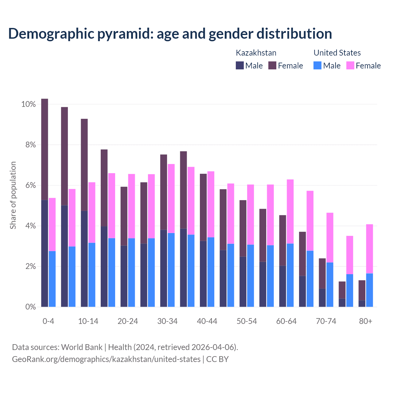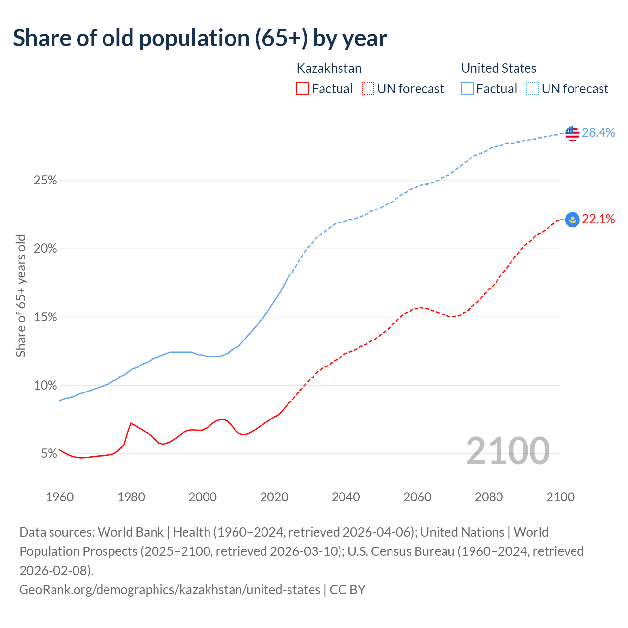 The share of older people aged 65 and over is 8.65% in Kazakhstan and 17.9% in the United States. Life expectancy in Kazakhstan compared to the United States .