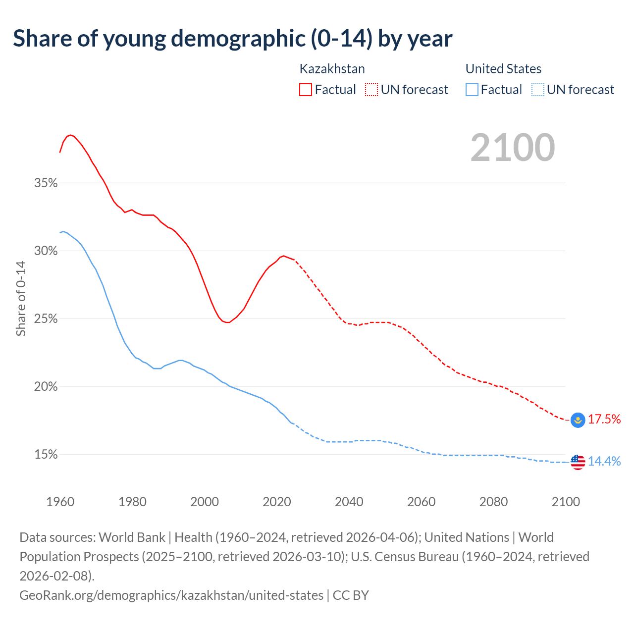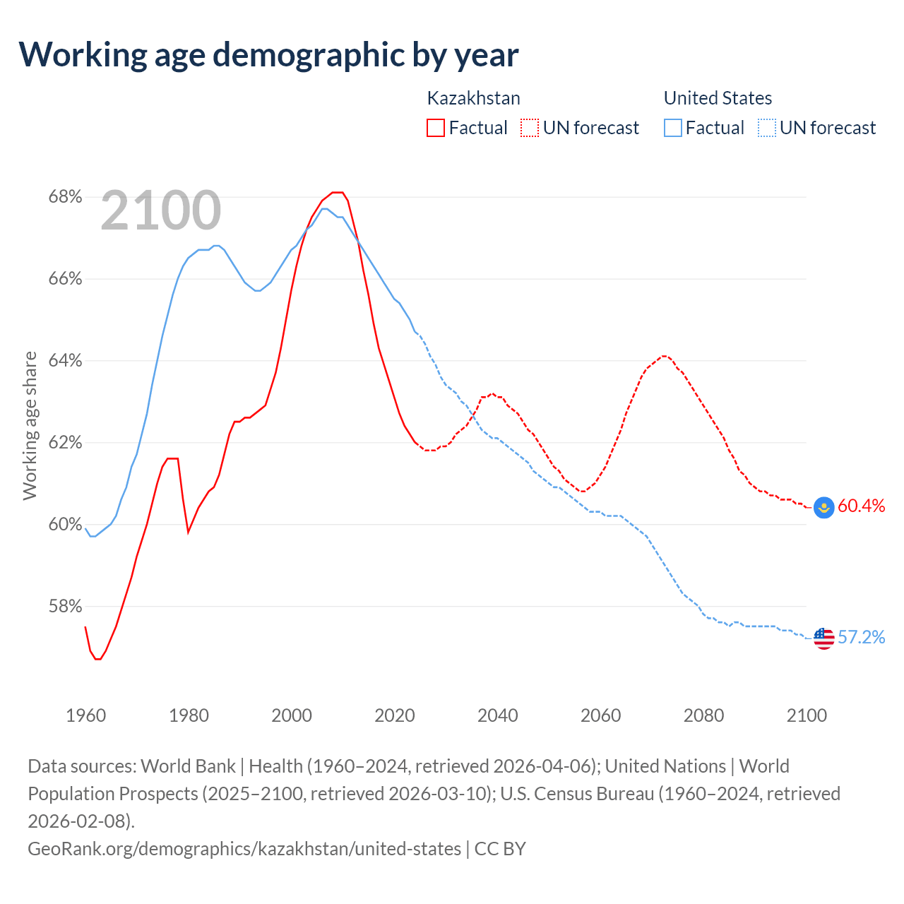 Median age Kazakhstan vs United States, 1960-2100
