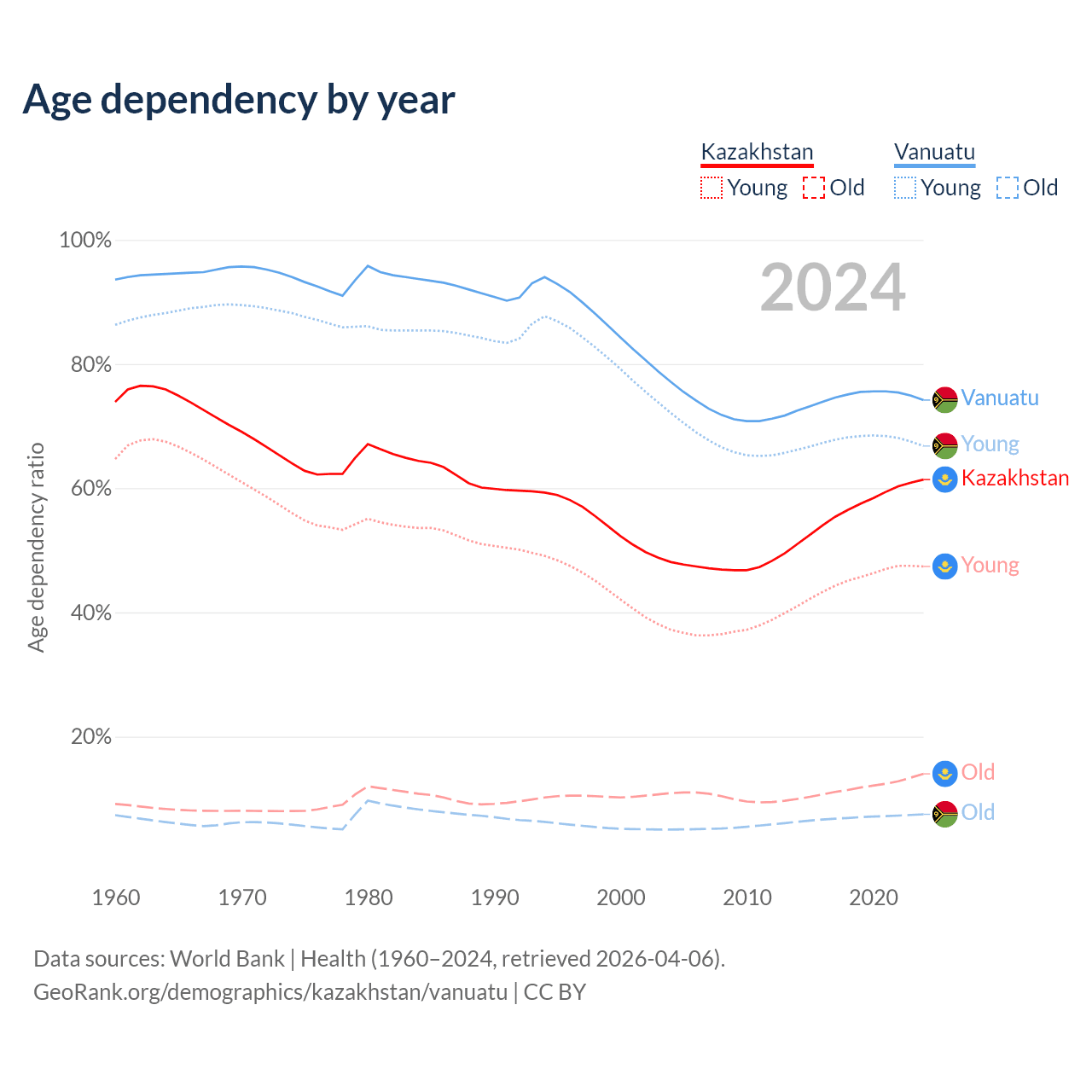 Data sources: World Bank | Health (1960–2024, retrieved 2026-04-06); U.S. Census Bureau (1960–2024, retrieved 2026-02-08).