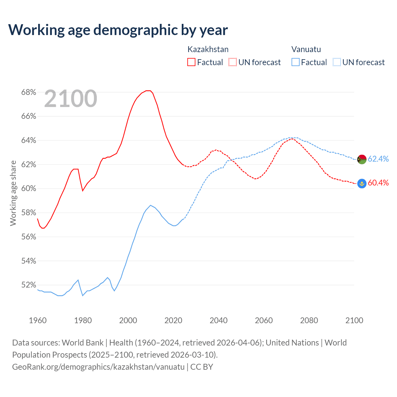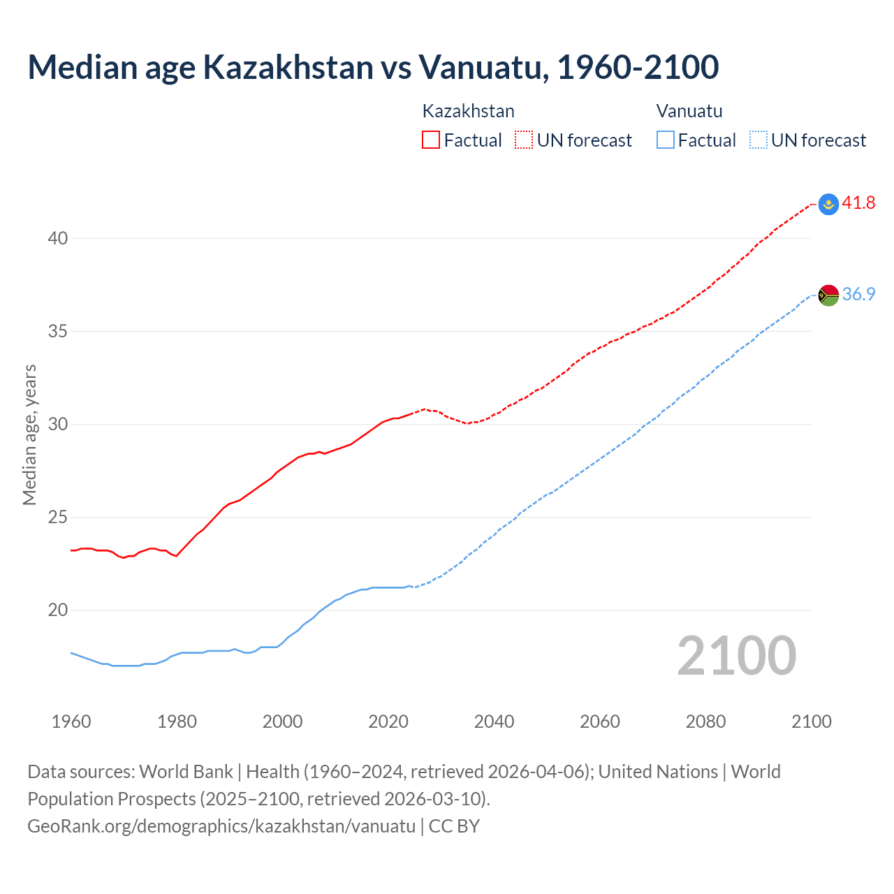 Median age Kazakhstan vs Vanuatu, 1960-2100