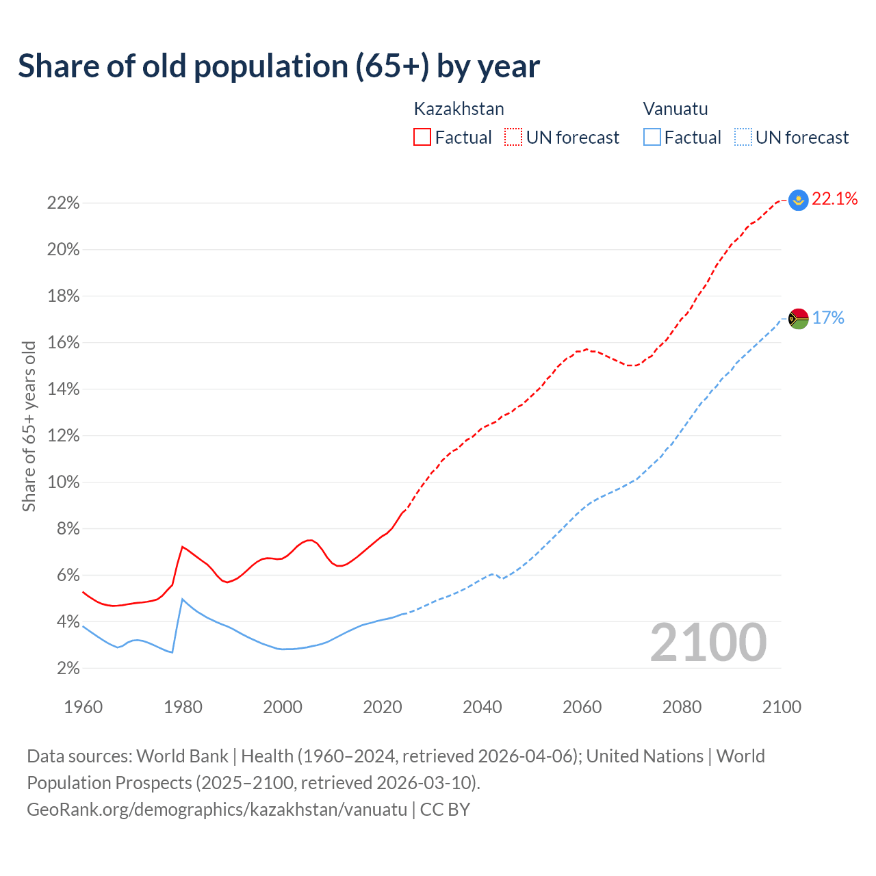 The share of older people aged 65 and over is 8.65% in Kazakhstan and 4.3% in Vanuatu. Life expectancy in Kazakhstan compared to Vanuatu .