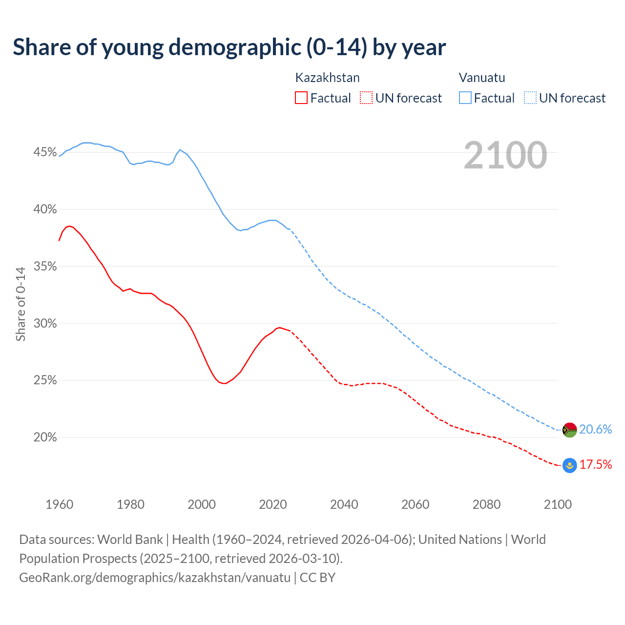- The share of young demographic (0-15 years old) in Kazakhstan is 29.4% vs 38.3% in Vanuatu.