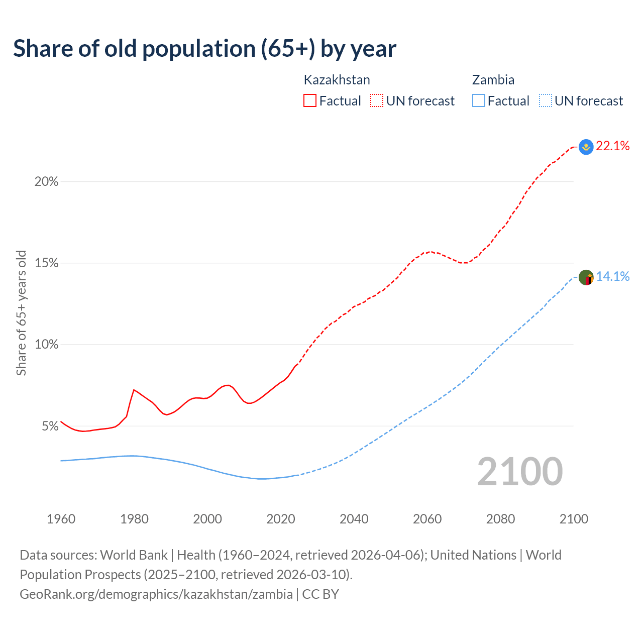 The share of older people aged 65 and over is 8.65% in Kazakhstan and 1.95% in Zambia. Life expectancy in Kazakhstan compared to Zambia .