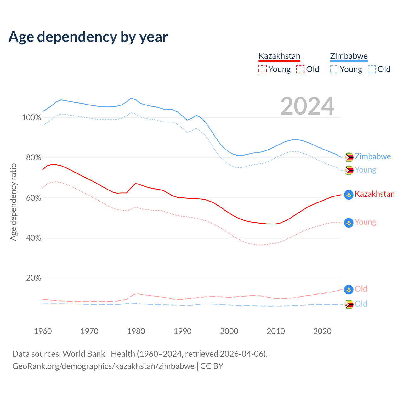 Data sources: World Bank | Health (1960–2024, retrieved 2026-04-06); U.S. Census Bureau (1960–2024, retrieved 2026-02-08).