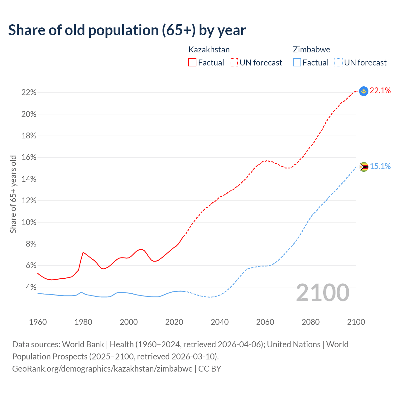 The share of older people aged 65 and over is 8.65% in Kazakhstan and 3.6% in Zimbabwe. Life expectancy in Kazakhstan compared to Zimbabwe .