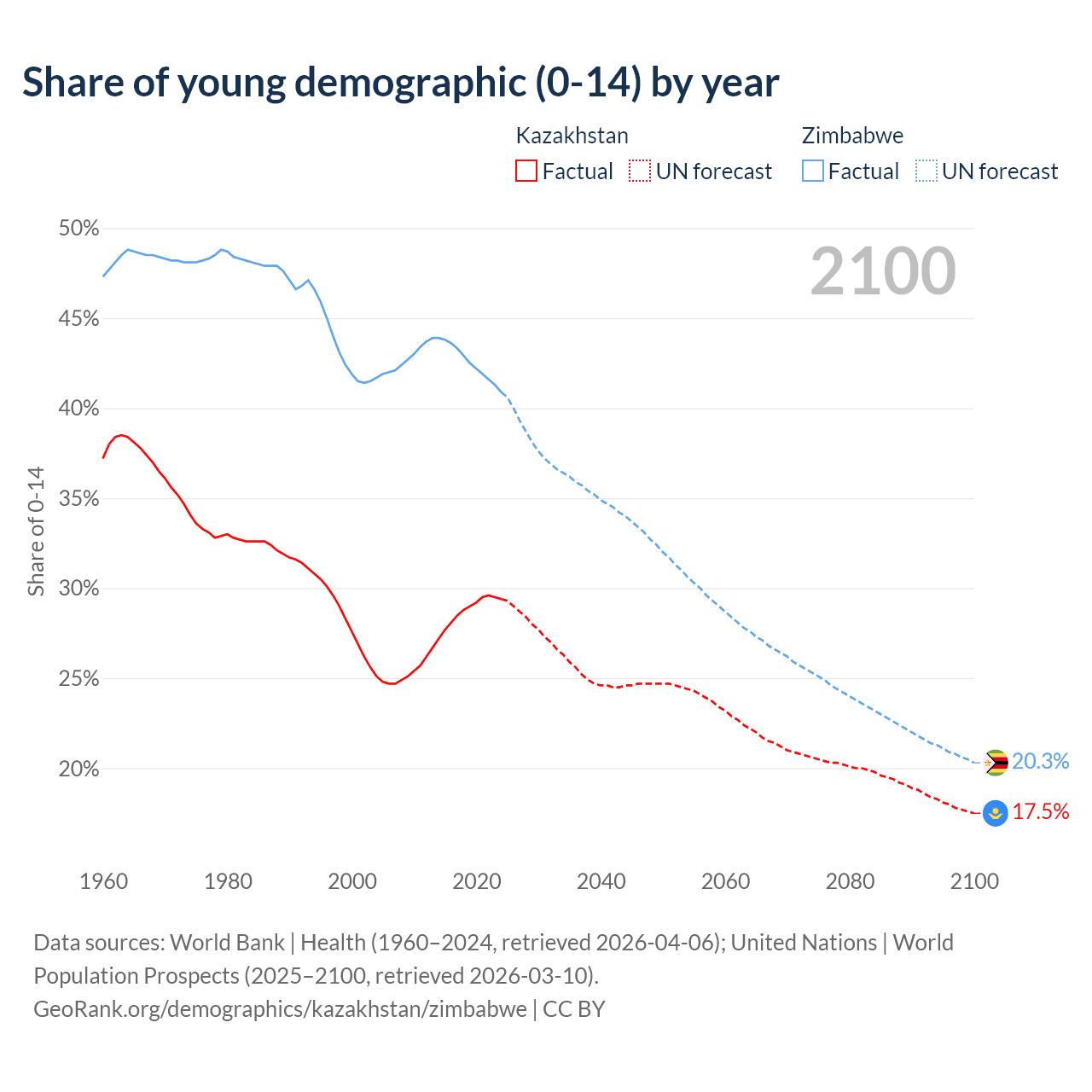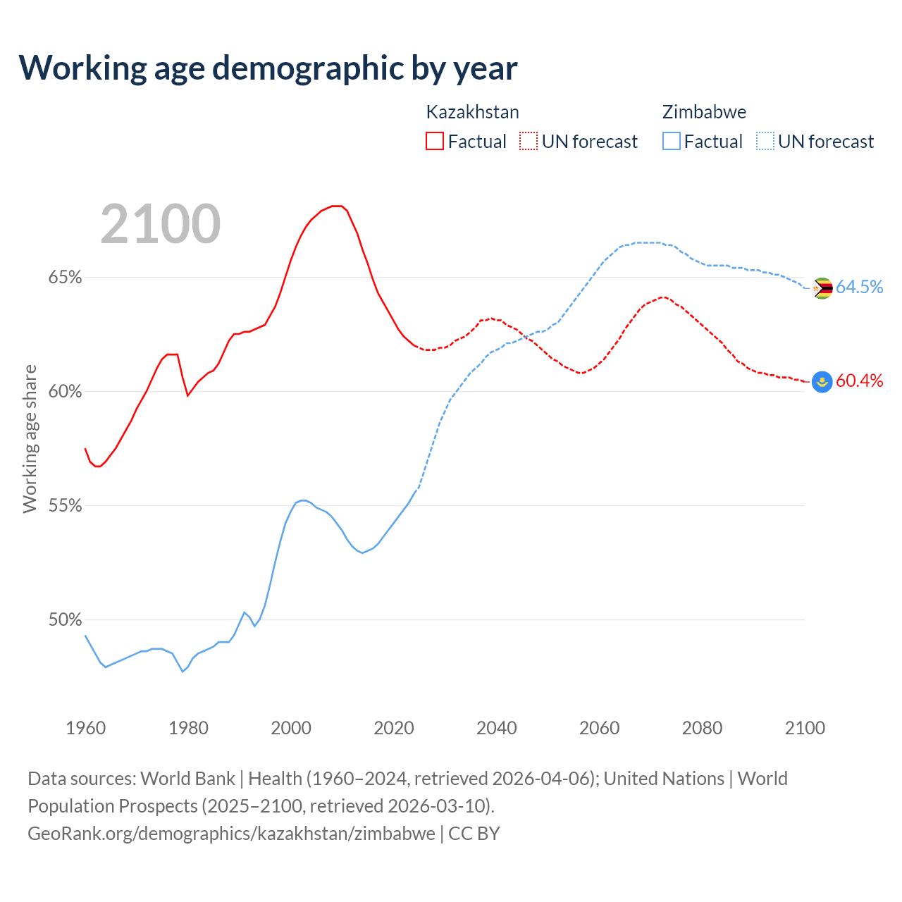 Median age Kazakhstan vs Zimbabwe, 1960-2100