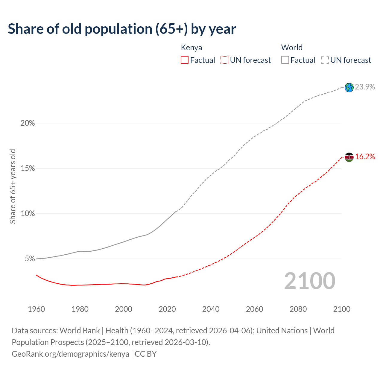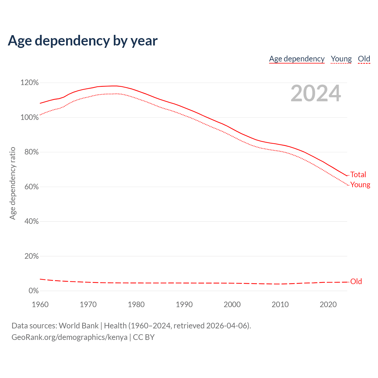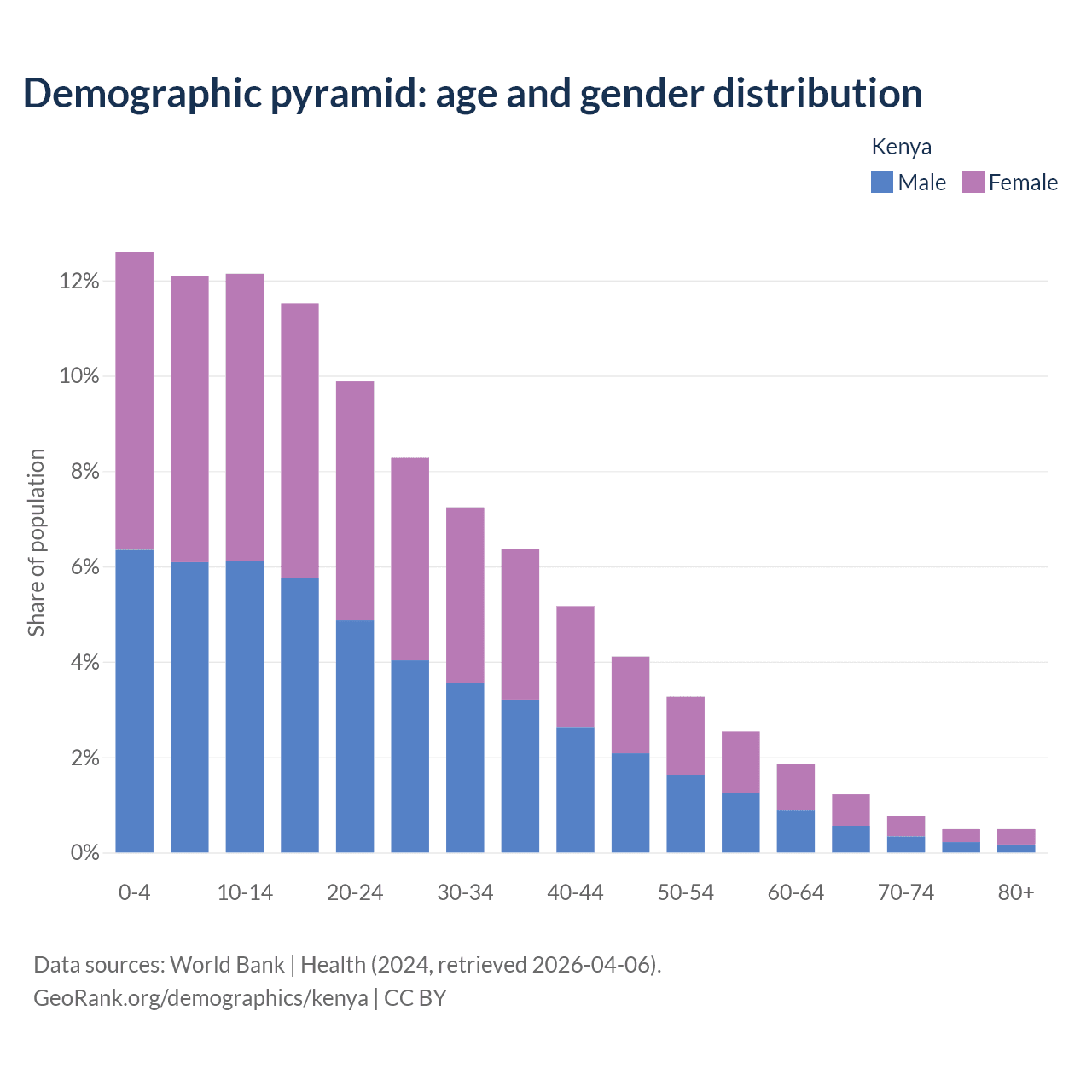 With a population of 56.4M people, Kenya has a median age of 20.8 years which makes it the 159/196 oldest country. 36.8% of the demographic are children 0-14 years old, 60.2% are working-age people aged 15-64, and 2.97% are older population aged 65+ years.