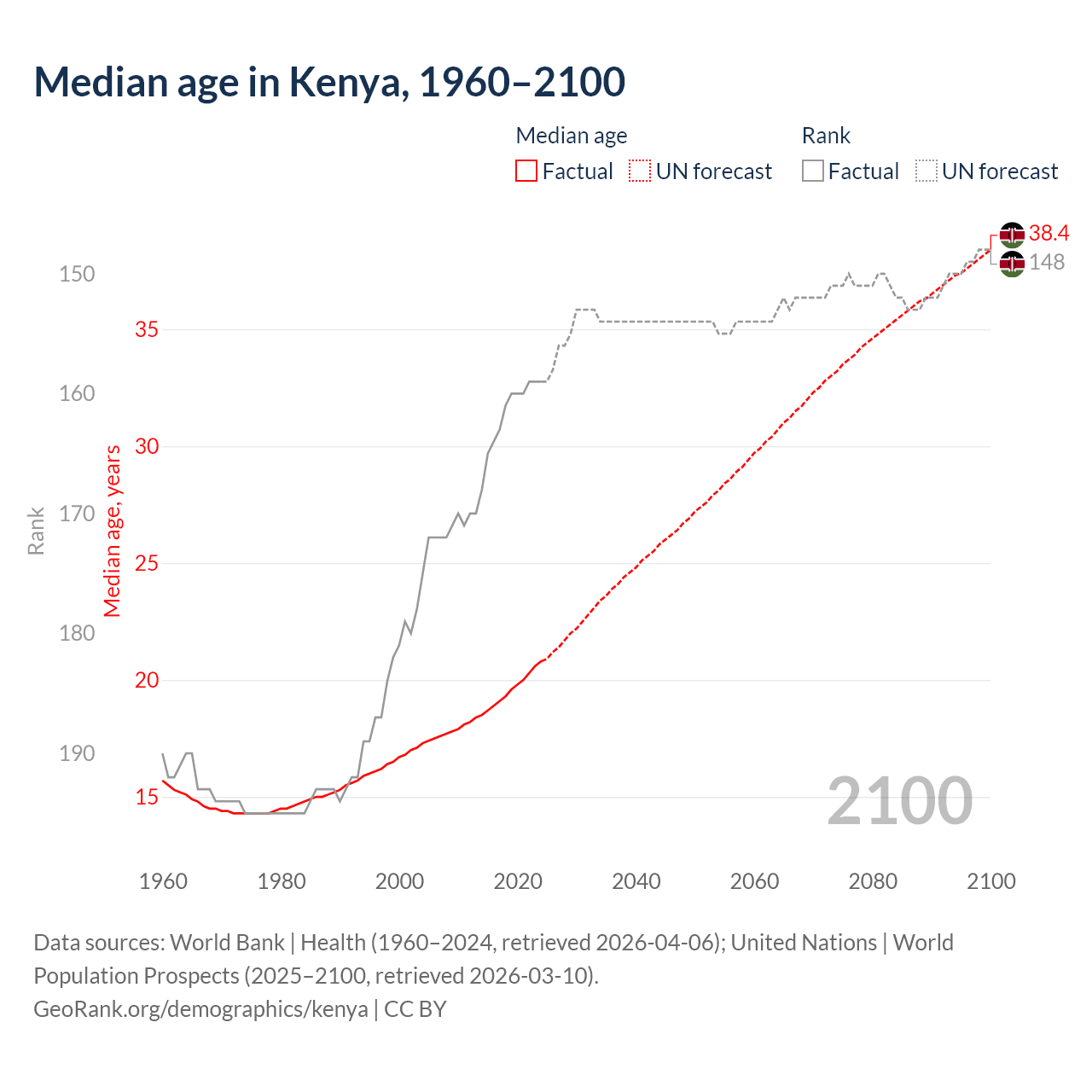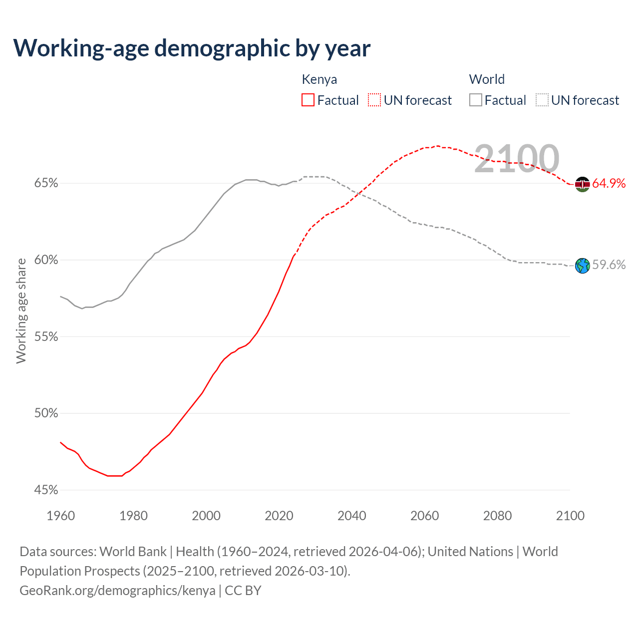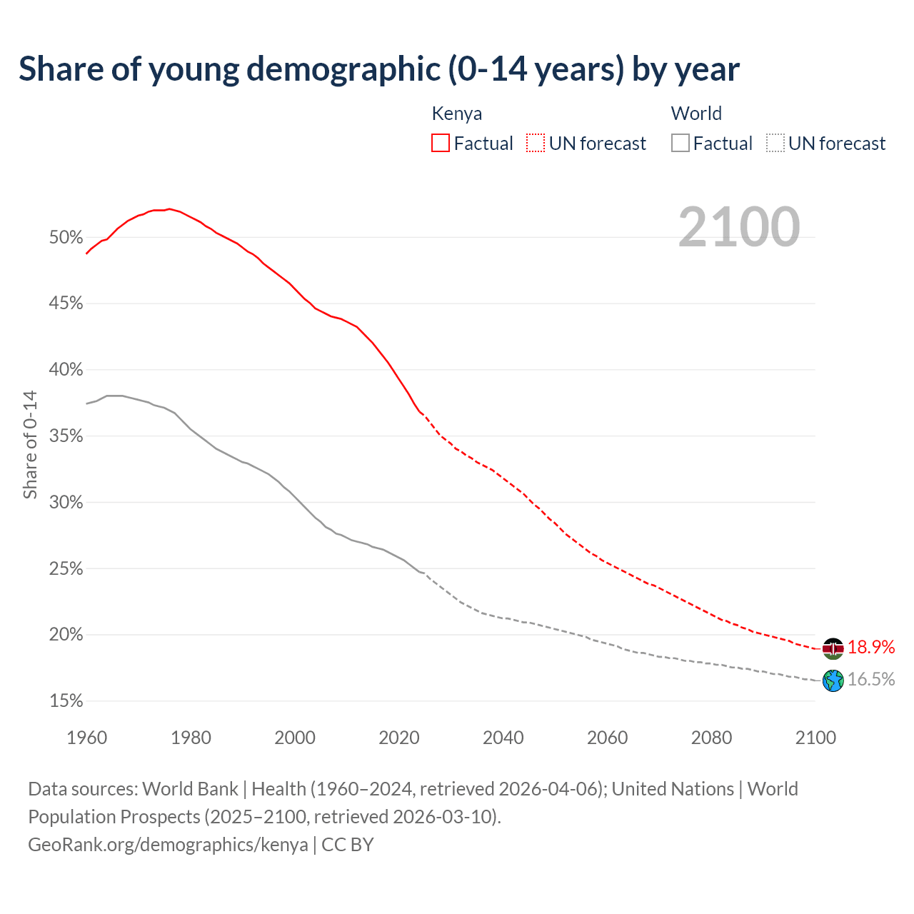 With a population of 56.4M people, Kenya has a median age of 20.8 years which makes it the 159/196 oldest country. 36.8% of the demographic are children 0-14 years old, 60.2% are working-age people aged 15-64, and 2.97% are older population aged 65+ years.