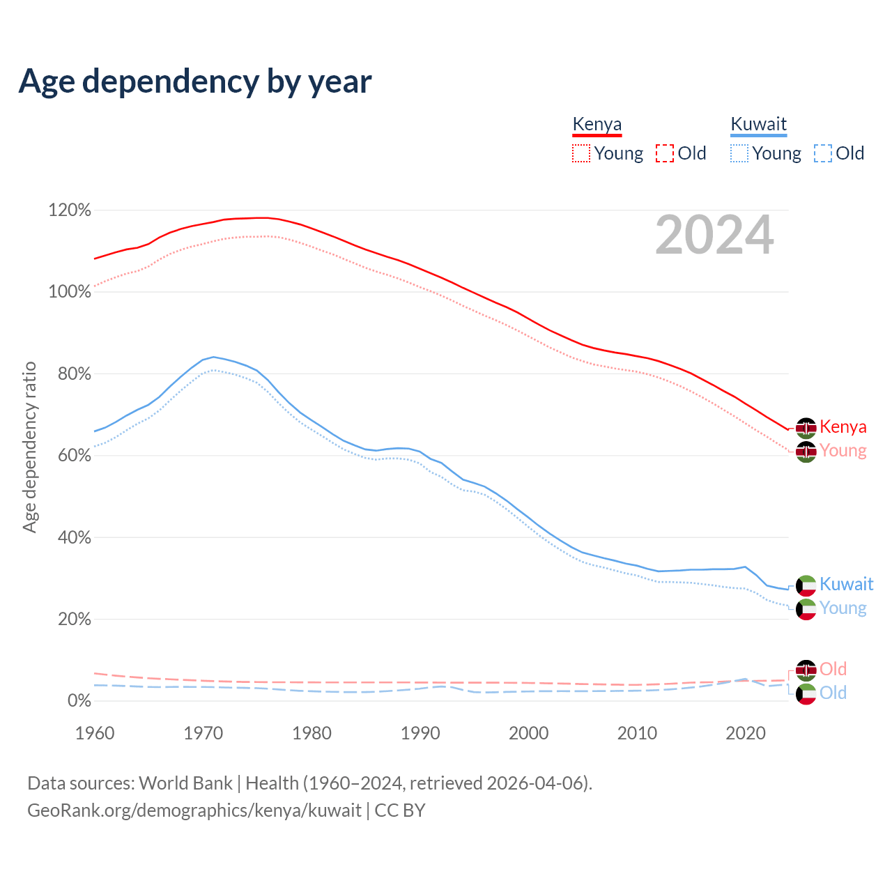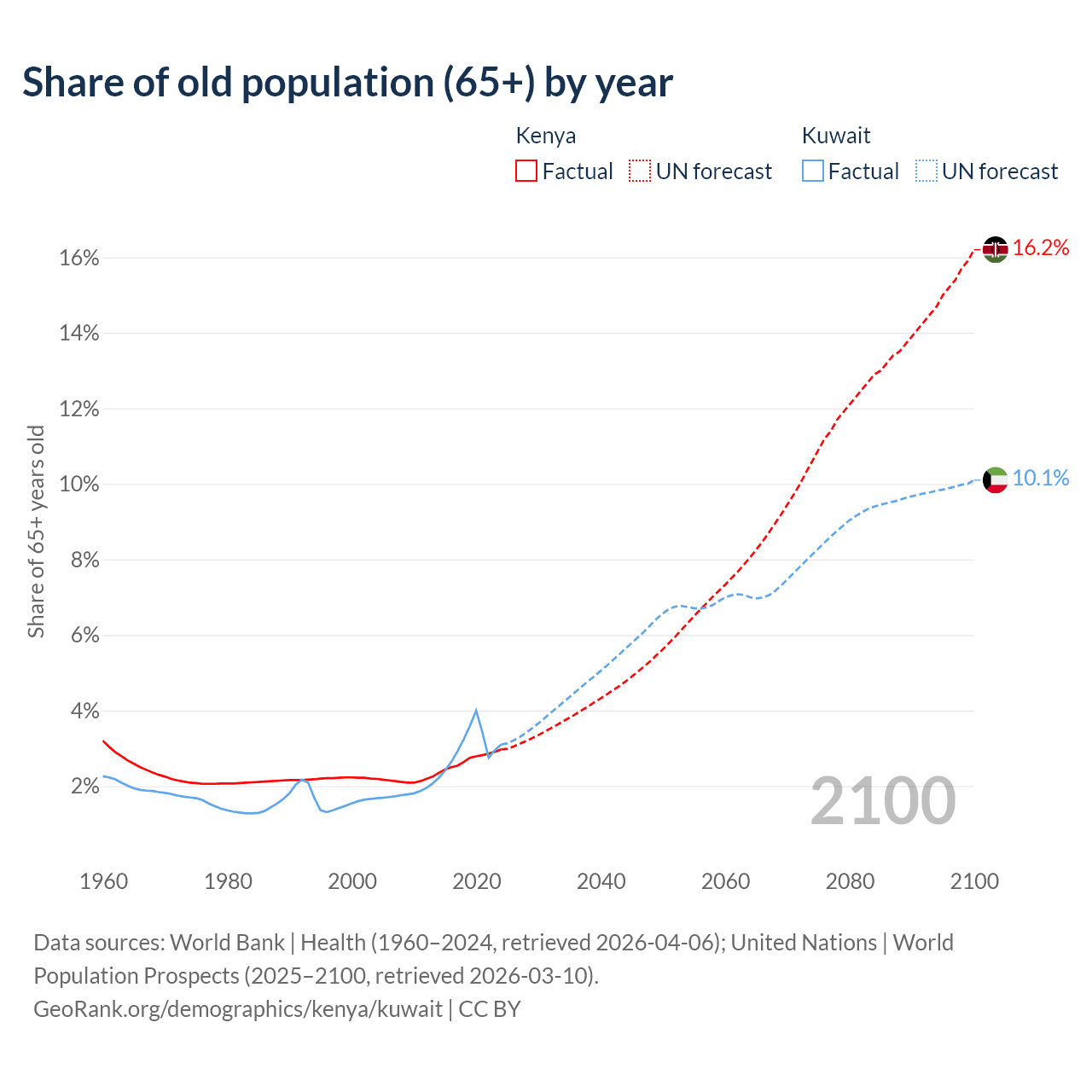 The share of older people aged 65 and over is 2.97% in Kenya and 3.1% in Kuwait. Life expectancy in Kenya compared to Kuwait .