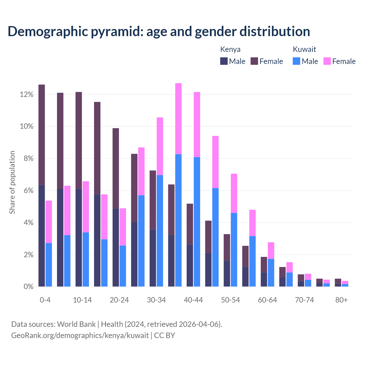 - As of 2026, the population of Kenya is 59M vs 5.1M in Kuwait - 11.6 times difference.
