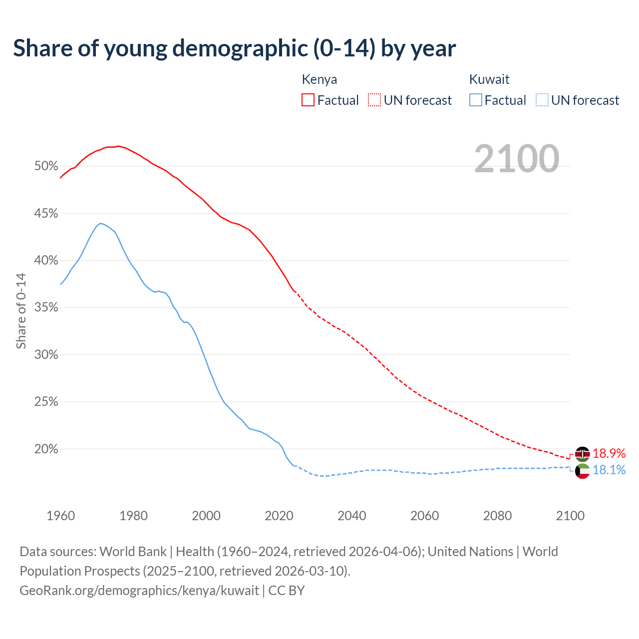 - The share of young demographic (0-15 years old) in Kenya is 36.8% vs 18.2% in Kuwait.