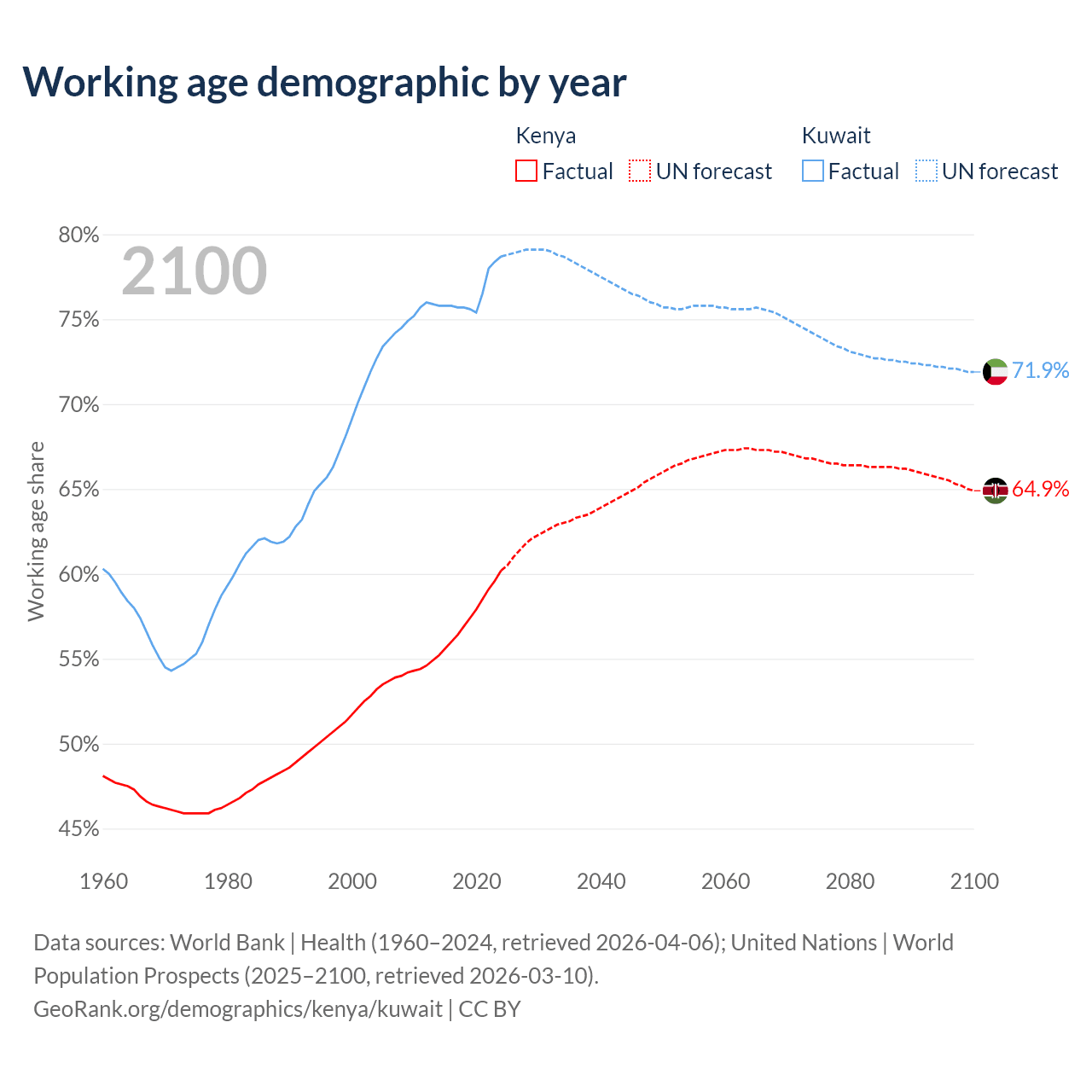 - Kenya has 35.5M working age adults (aged 15-64) vs 4.01M in Kuwait.