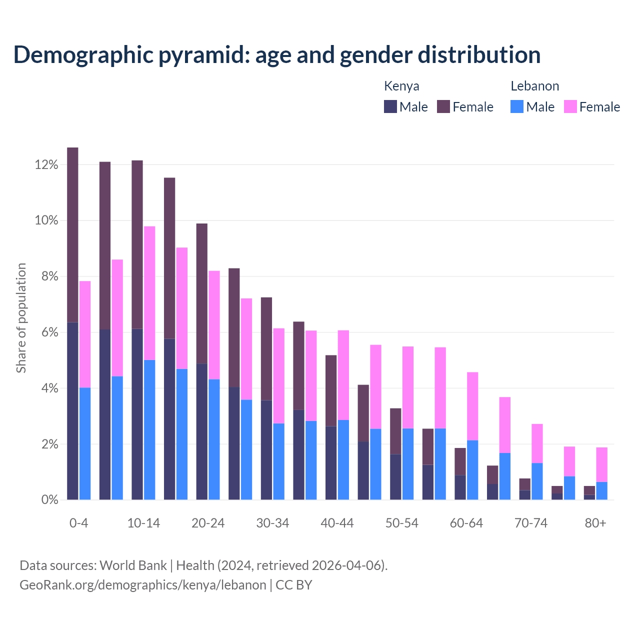 - Kenya is ranked 159/196 by median age (oldest to youngest) vs 106/196 for Lebanon.