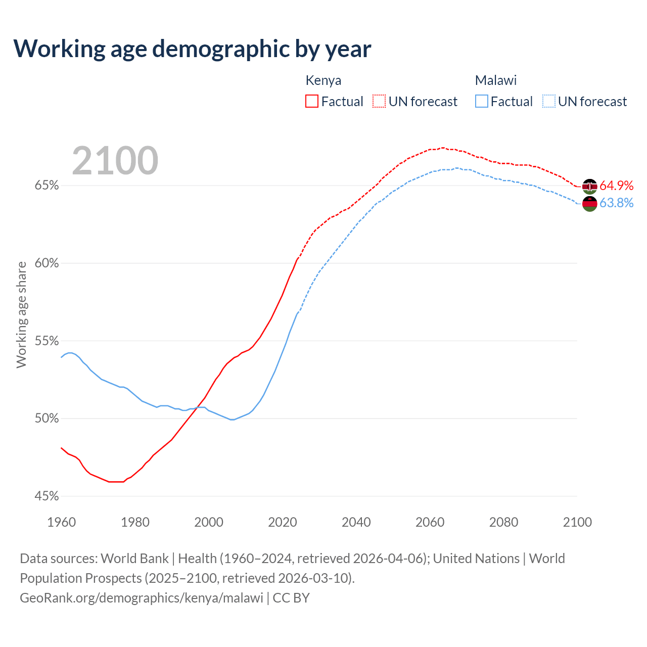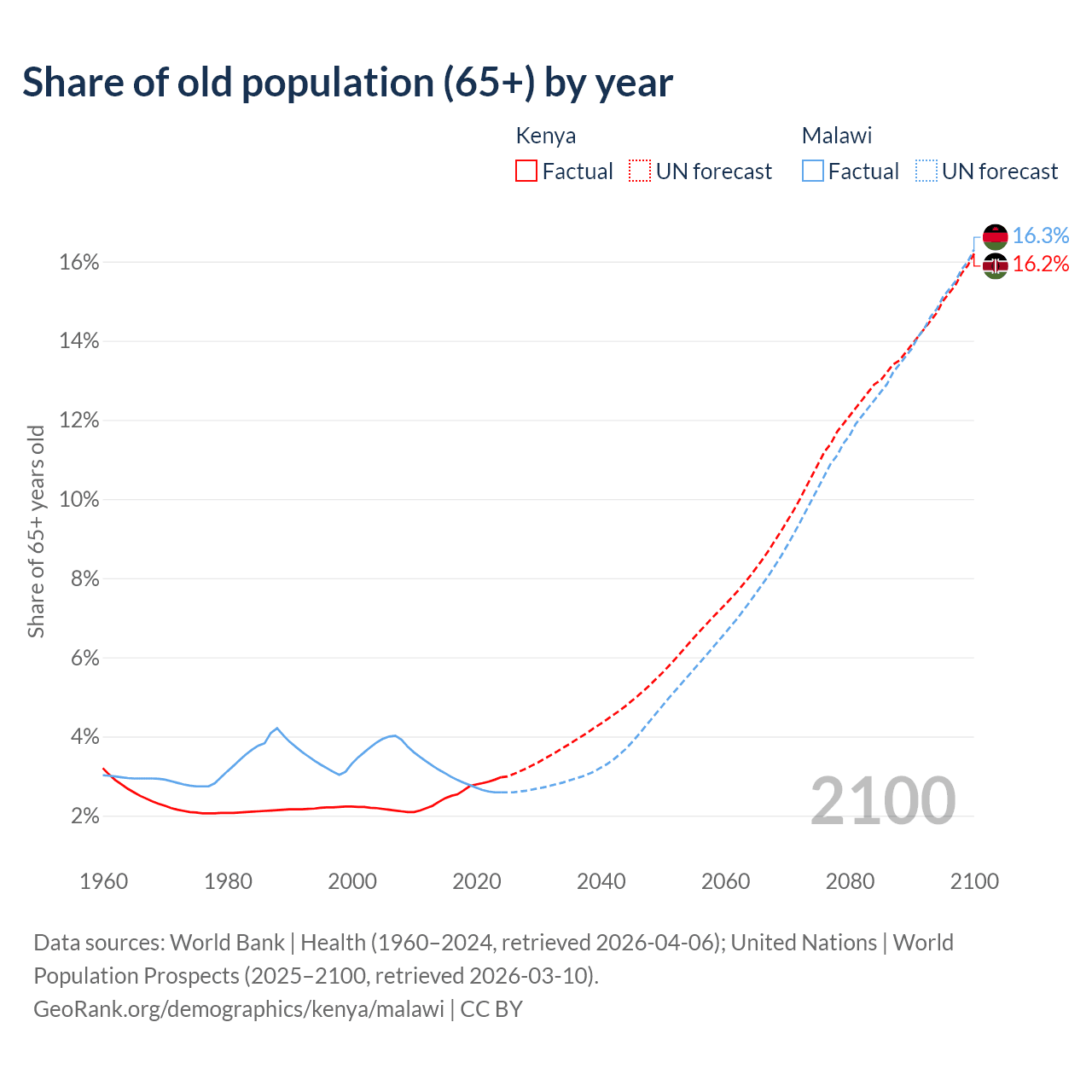 The share of older people aged 65 and over is 2.97% in Kenya and 2.59% in Malawi. Life expectancy in Kenya compared to Malawi .