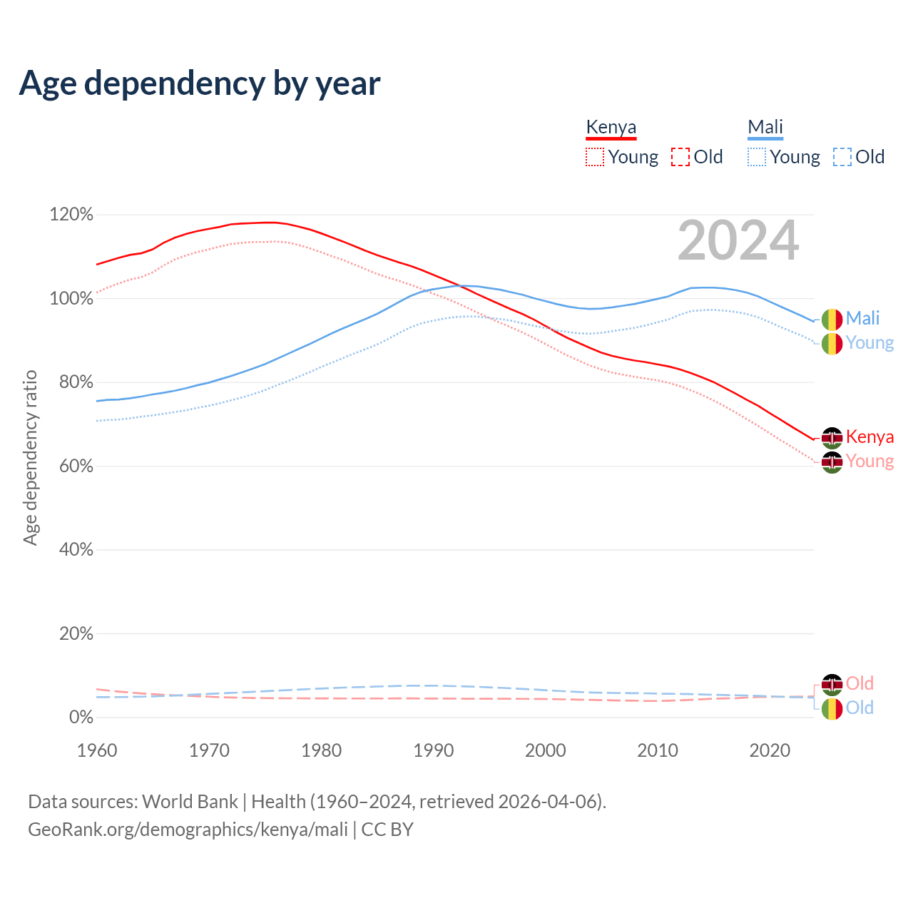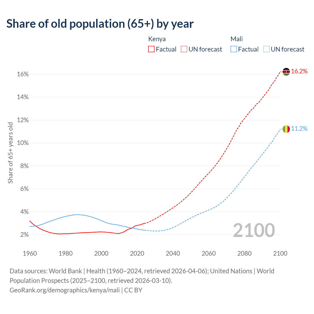 - The share of old-age demographic (65+) in Kenya is 2.97% vs 2.38% in Mali.
