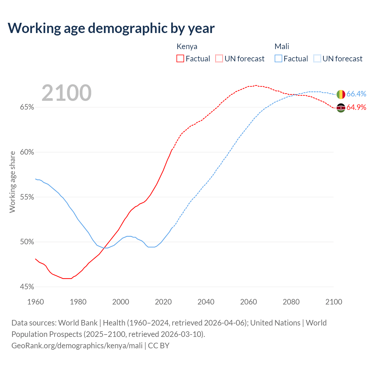 - Kenya has 35.5M working age adults (aged 15-64) vs 13.5M in Mali.